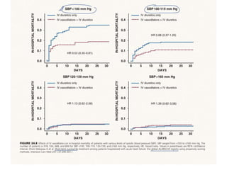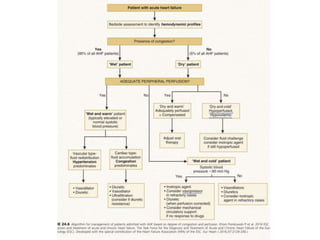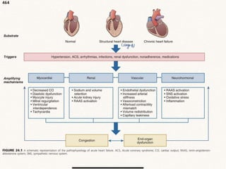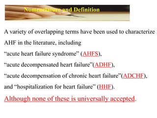 The document discusses acute decompensated heart failure (ADHF). It defines ADHF and describes the underlying pathophysiology as complex, involving substrates, triggers, and amplifying mechanisms. Common symptoms include dyspnea and signs of congestion. The physical exam focuses on assessing perfusion and congestion. Classification systems distinguish new onset HF from exacerbation of chronic HF, with the latter being most common.