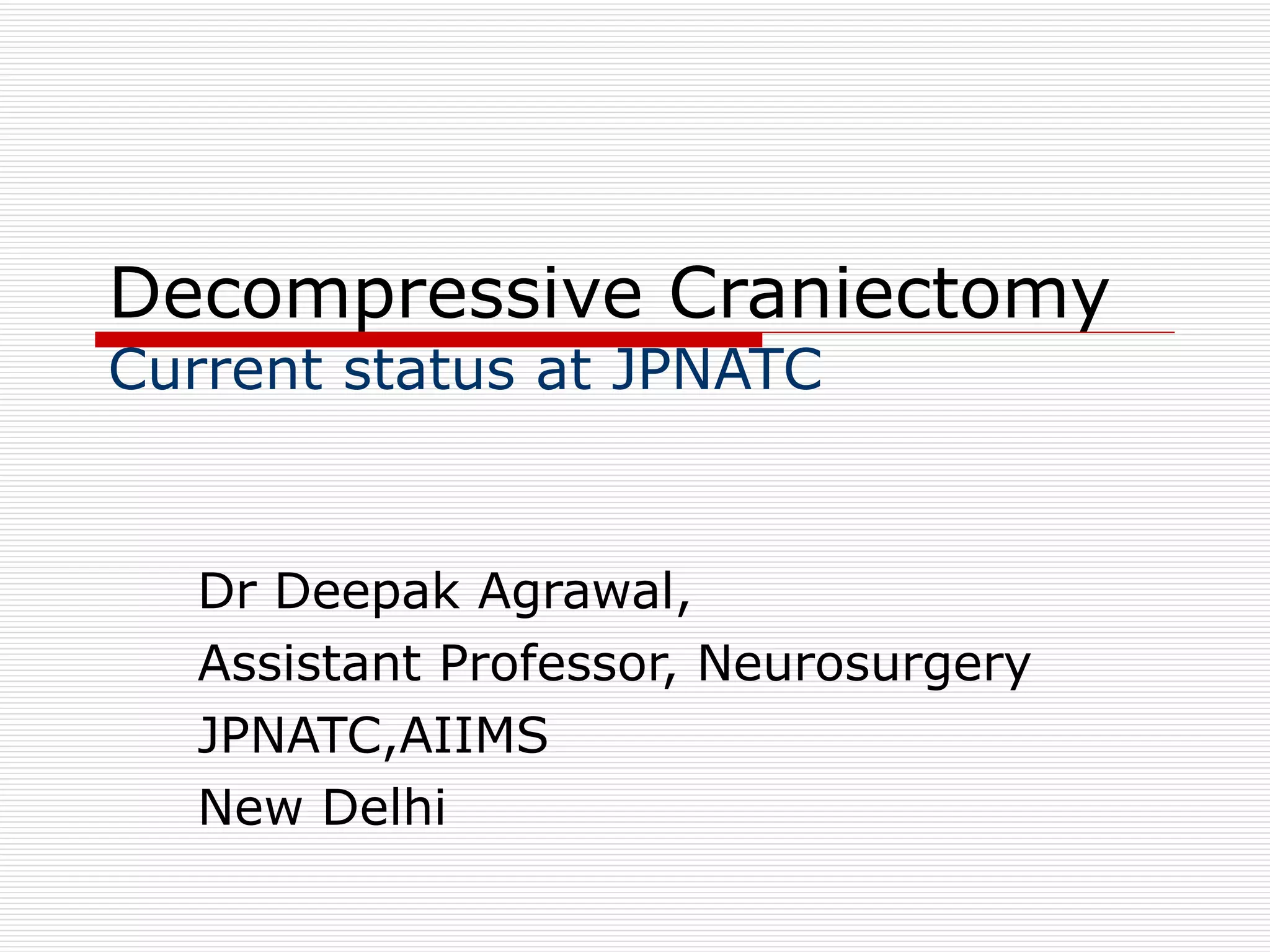 Decompressive craniectomy is used at JPNATC to treat severe traumatic brain injuries. Between January 2008 and November 2008, 24.1% of patients with severe head injuries underwent decompressive craniectomy. The indications for decompressive craniectomy at JPNATC include severe head injury with acute subdural hematoma, midline shift, and mass effect; intracerebral contusions with mass effect and midline shift; and diffuse axonal injury with effaced cisterns and intracranial pressure above 20 despite maximum medical therapy.