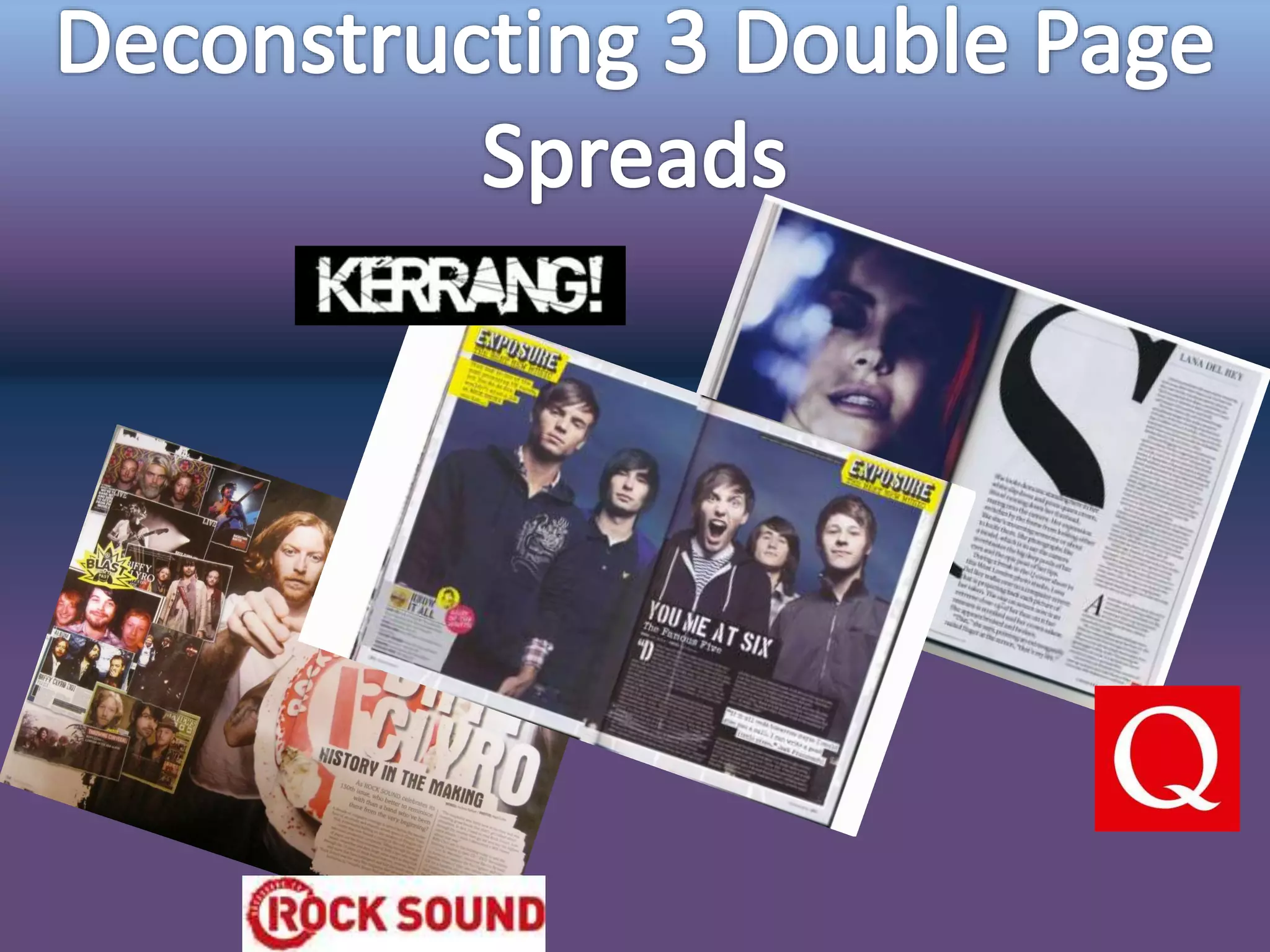 The document summarizes the layout and design elements of two magazine pages. The first page uses minimal colors, a small font size, and tightly packed columns and paragraphs to fit a lot of text into a small space. Nearly the entire page is used, including dedicating one page to a large image. The second page uses a color scheme of blues, whites, and yellows to divide the background image and page information. Images and text are placed intentionally throughout the pages to guide the reader's eye in a scrapbook-style layout.