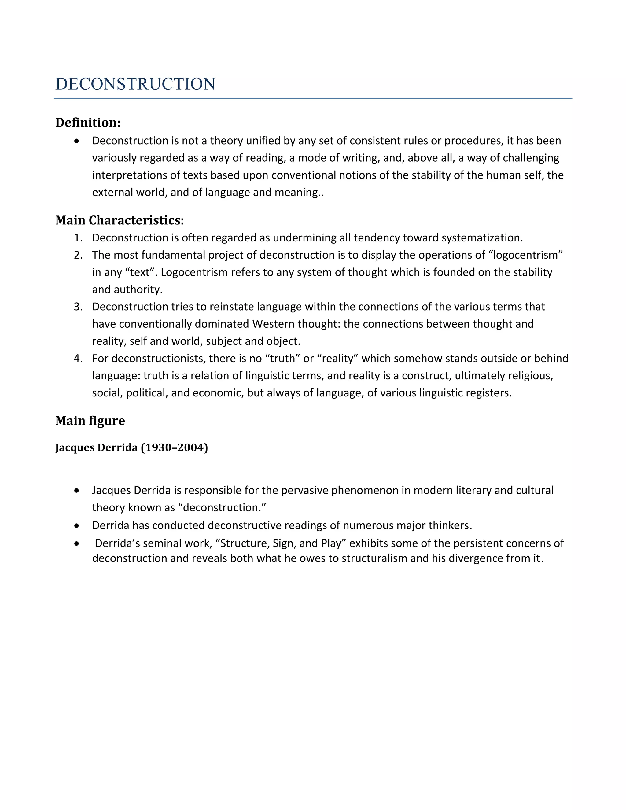 Deconstruction challenges conventional notions of stability in language, meaning, and interpretation. It undermines tendencies toward systematization and instead focuses on displaying "logocentrism", or how language constructs reality and truth. The goal is to reinstate language as relational and constructed rather than reflecting external realities. Jacques Derrida is largely responsible for developing deconstruction through his readings of major thinkers and seminal work on the nature of structure, sign, and play in language and meaning.