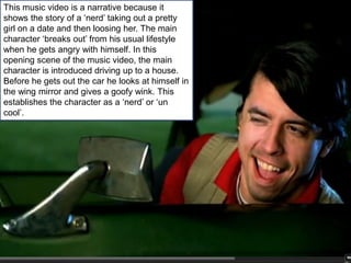 This music video tells the narrative story of a nerdy main character who takes a pretty girl on a date but loses her. The opening scene introduces the main character driving up to a house, where he gives himself a goofy wink in the mirror to establish his nerdy personality. Several scenes show the main character having two distinct personalities - his nerdy one and a cooler one inspired by being in a rock band. The music video culminates in the main character fully embracing his rock star personality as he performs with his whole band at the end.