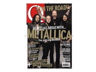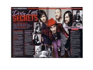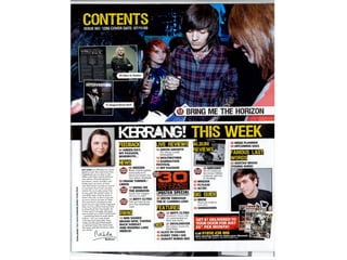 This document contains analyses of magazine covers and contents pages from various rock music magazines such as Kerrang, NME, and Q Magazine. The analyses describe visual elements that would attract readers' attention, including prominent images of bands and their members, eye-catching fonts and colors, and previews of featured articles. The target audiences of the magazines are identified as generally male, ranging from teenagers to older generations, depending on the styles of music featured.