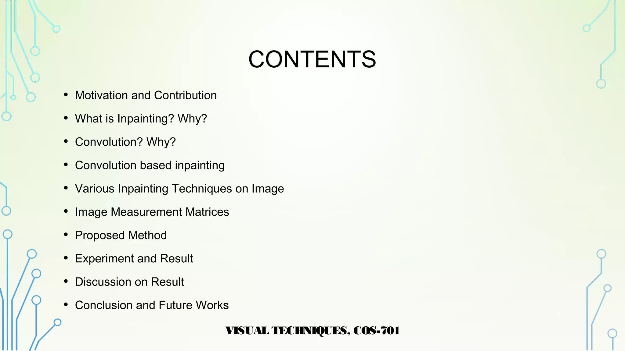 The document discusses inpainting, a technique for reconstructing damaged or missing areas in images, and presents various algorithms, including one developed by the author that reduces processing time and avoids image blurring. It reviews traditional and convolution-based methods, outlining their applications in image restoration. The proposed method demonstrates improved execution times and results, indicating its potential for future use in both 2D and 3D image processing.