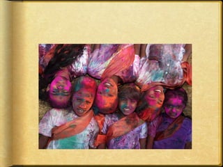 The document provides inspiration and tips for using color in home decorating. It discusses celebrating color like the festival of Holi and experimenting with bold shades. Specific color palettes and decor elements are suggested for different rooms, including area rugs, slipcovers, silk flowers, and table settings. Feng shui tips focus on using color and clearing clutter for good energy in the fall season.