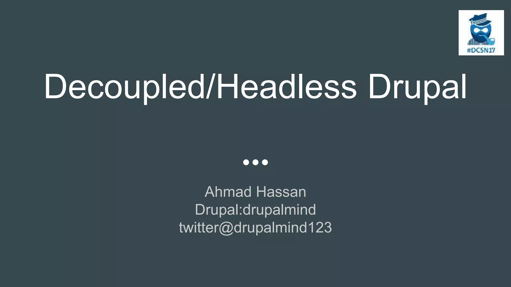This document discusses decoupled or headless Drupal architectures. It defines decoupled Drupal as allowing other technologies to render the front-end experience, while Drupal serves as the content provider. Real-world examples are provided to illustrate the request-response pattern. Normal Drupal architecture is contrasted with headless architectures, where Drupal outputs JSON data via REST APIs rather than HTML. Headless Drupal can then connect to multiple front-end clients and frameworks. Drupal 7 and 8 options for decoupling are examined, as well as a case study of using Drupal 7 as a content provider with a Symfony front-end.