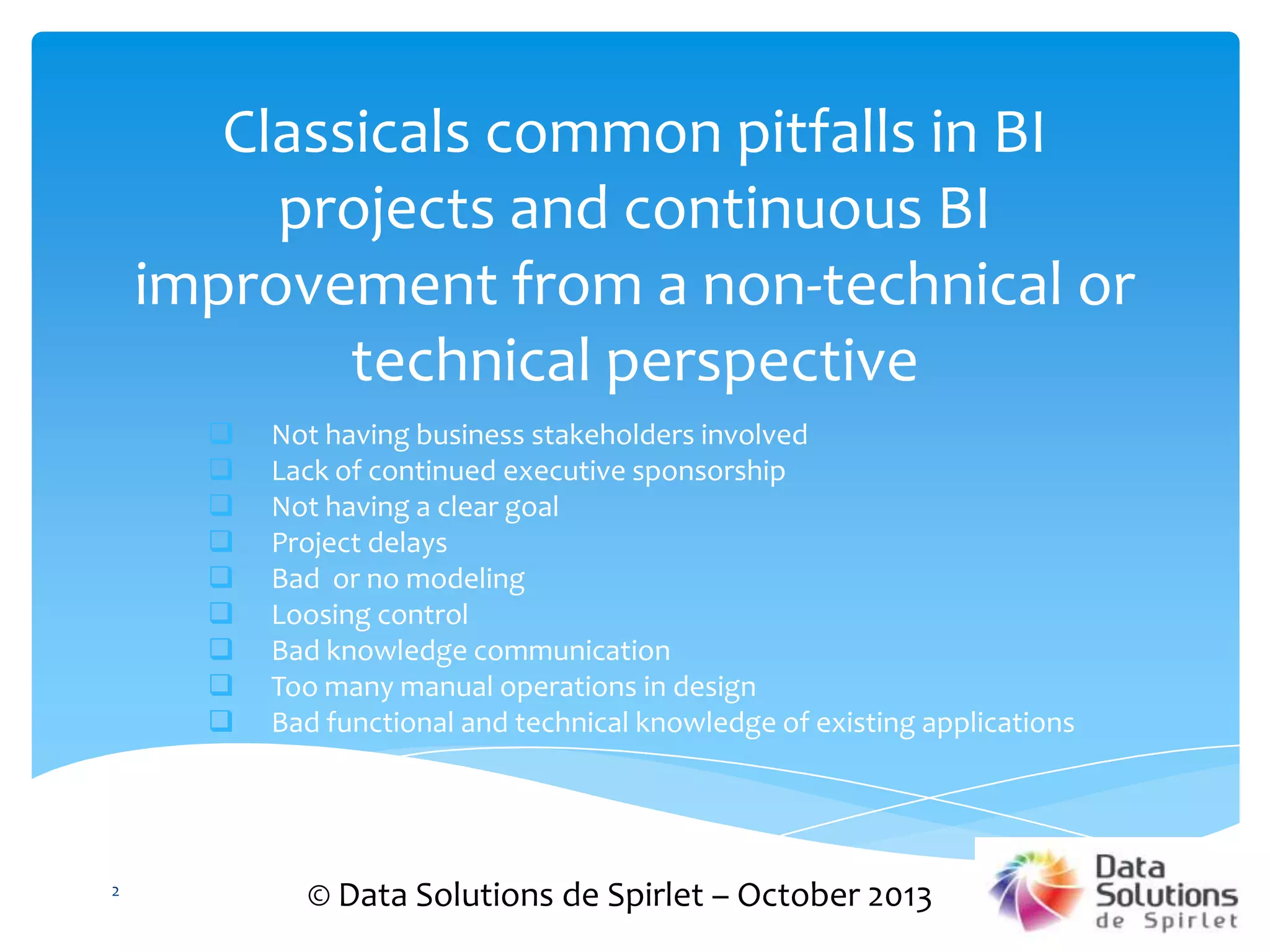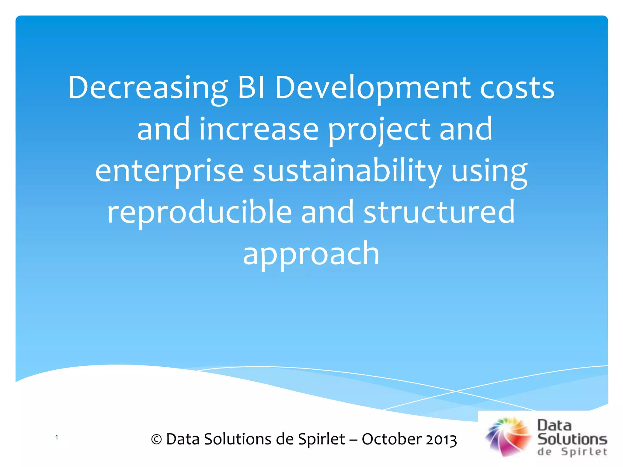 The document discusses a structured approach to reduce BI development costs while enhancing project sustainability by using an ERD/MD model generator that automates model generation and ensures traceability. It highlights common pitfalls in BI projects, such as lack of stakeholder involvement and poor communication, and presents the generator as a solution that significantly speeds up model production and improves design quality. The tool also facilitates efficient job scheduling and addresses implementation challenges across various BI steps.