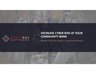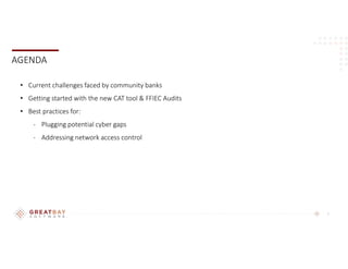 The document outlines strategies for reducing cyber risk at community banks, focusing on challenges faced, the FFIEC Cybersecurity Assessment Tool (CAT), and best practices for security controls. Key areas include risk management, threat intelligence, cybersecurity controls, and incident management, emphasizing the importance of comprehensive assessments and employee training. Recommendations also highlight the need for ongoing monitoring, secure access management, and adherence to regulatory guidelines to protect customer information.