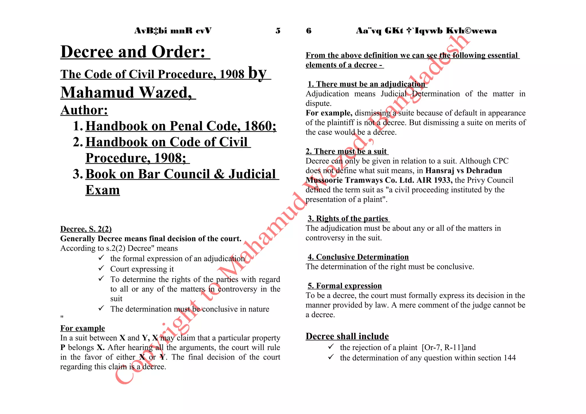 The document discusses the definitions and types of decrees and orders according to the Code of Civil Procedure, 1908. It defines a decree as the formal expression of an adjudication by a court determining the rights of parties regarding matters in controversy in a suit. A decree must be conclusive in nature. There are two types of decrees: preliminary and final. An order is defined as a formal expression of a court's decision that is not a decree. Key differences between decrees and orders are that decrees determine rights conclusively, there can only be one decree per suit, and all decrees are appealable unless expressly barred.