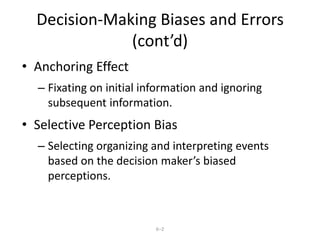 This document discusses various biases and errors that can negatively impact decision making, such as heuristics, overconfidence bias, immediate gratification bias, anchoring effect, selective perception bias, framing bias, and availability bias. It also outlines guidelines for effective decision making, such as understanding cultural differences, knowing when to quit, and using an effective process. An effective process focuses on importance, is logical and consistent, acknowledges both subjective and objective thinking, and requires only necessary information. Group decision making can provide benefits like more complete information but also disadvantages like time consumption and pressure to conform. Culture also impacts decision making approaches.