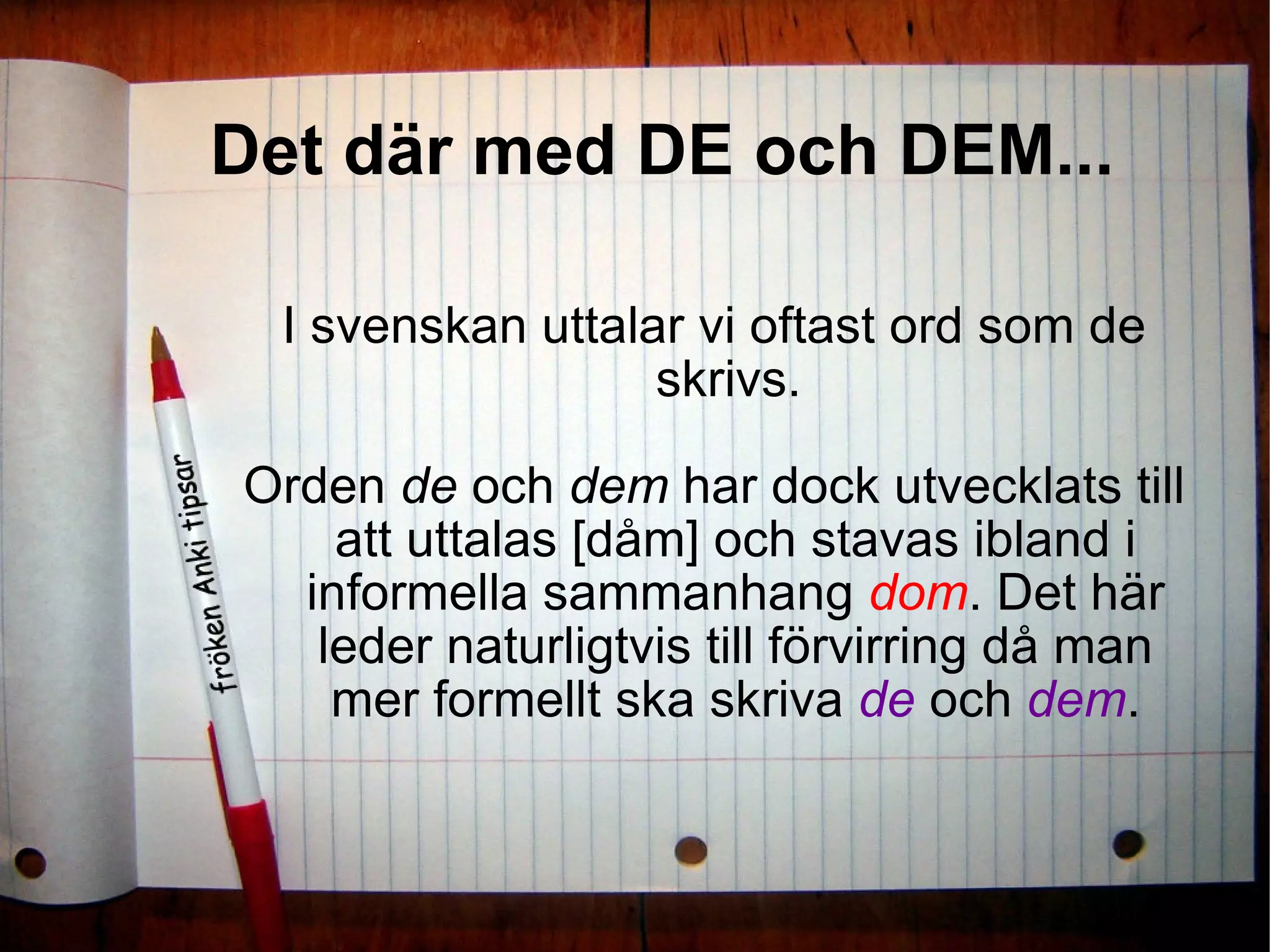 Det där medDE och DEM... I svenskan uttalar vi oftast ord som de skrivs. Orden de och dem har dock utvecklats till att uttalas [dåm] och stavas ibland i informella sammanhang dom . Det här leder naturligtvis till förvirring då man mer formellt ska skriva de och dem .