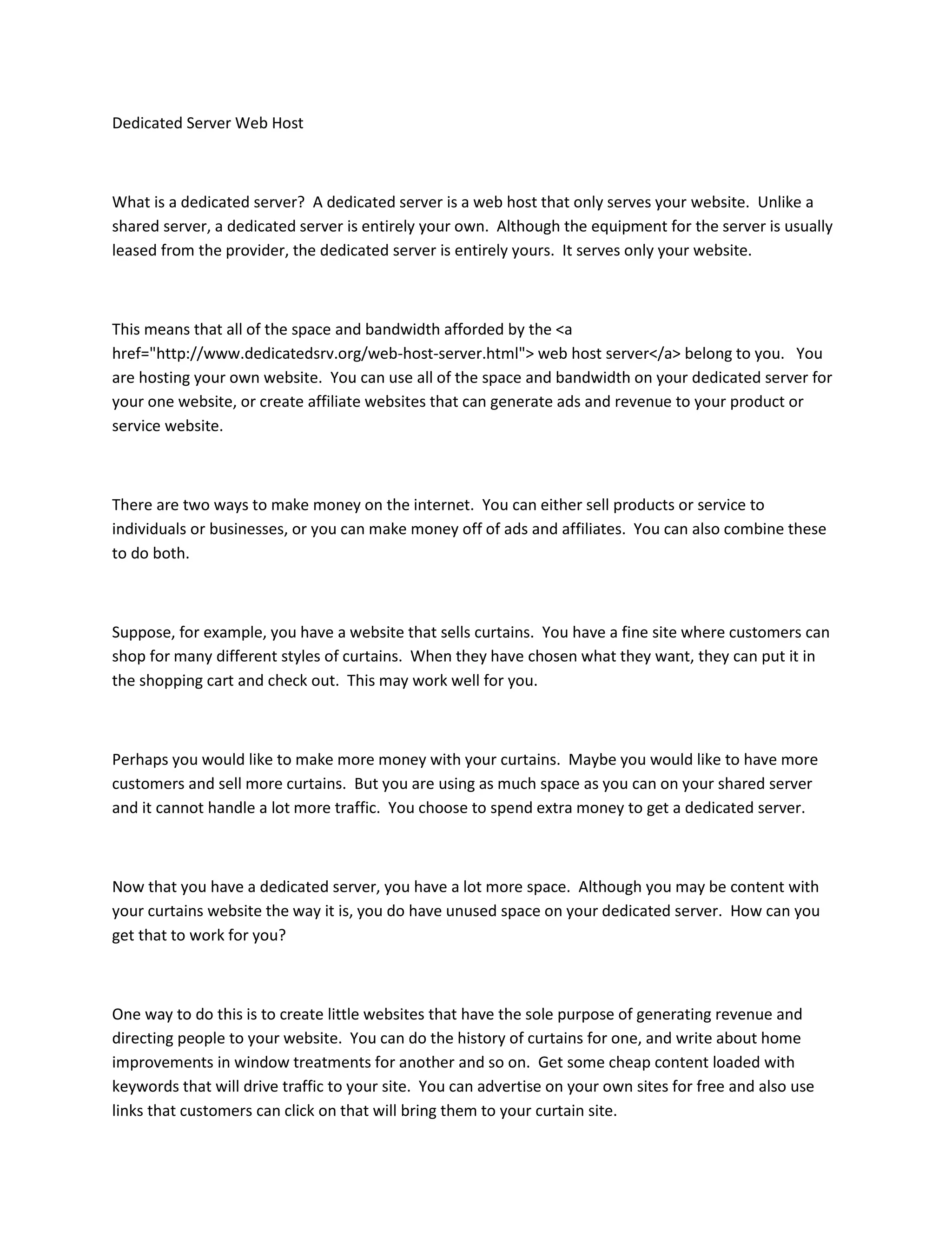 A dedicated server is a web hosting solution that serves only your website, providing exclusive space and bandwidth compared to shared servers. This allows users to host their primary site and create additional sites for generating revenue through affiliate marketing and ads. By leveraging a dedicated server, individuals can enhance traffic and income potential beyond just selling products or services.