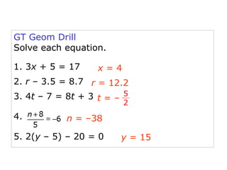 2. Key concepts covered include using properties of equality to write algebraic proofs, properties of congruence corresponding to properties of equality, and identifying properties of equality and congruence that justify statements.