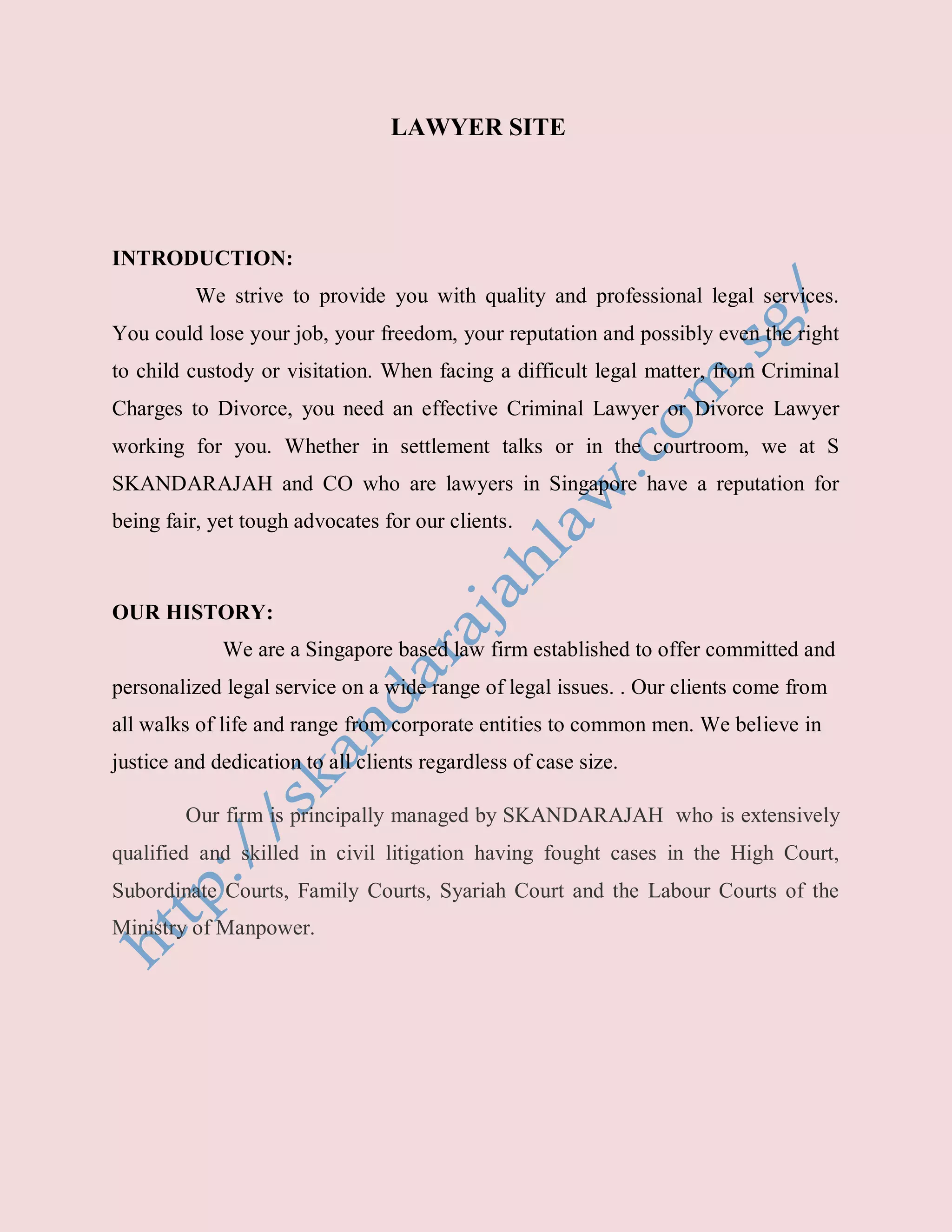 Skandarajah & Co is a Singapore-based law firm providing professional legal services across various areas, including criminal law, divorce, family law, personal injuries, and contractual disputes. The firm is managed by Skandarajah, who has extensive experience in civil litigation, and is committed to client-centered services as evidenced by their motto. They cater to a diverse clientele ranging from individuals to corporations and emphasize the importance of justice and personalized legal support.