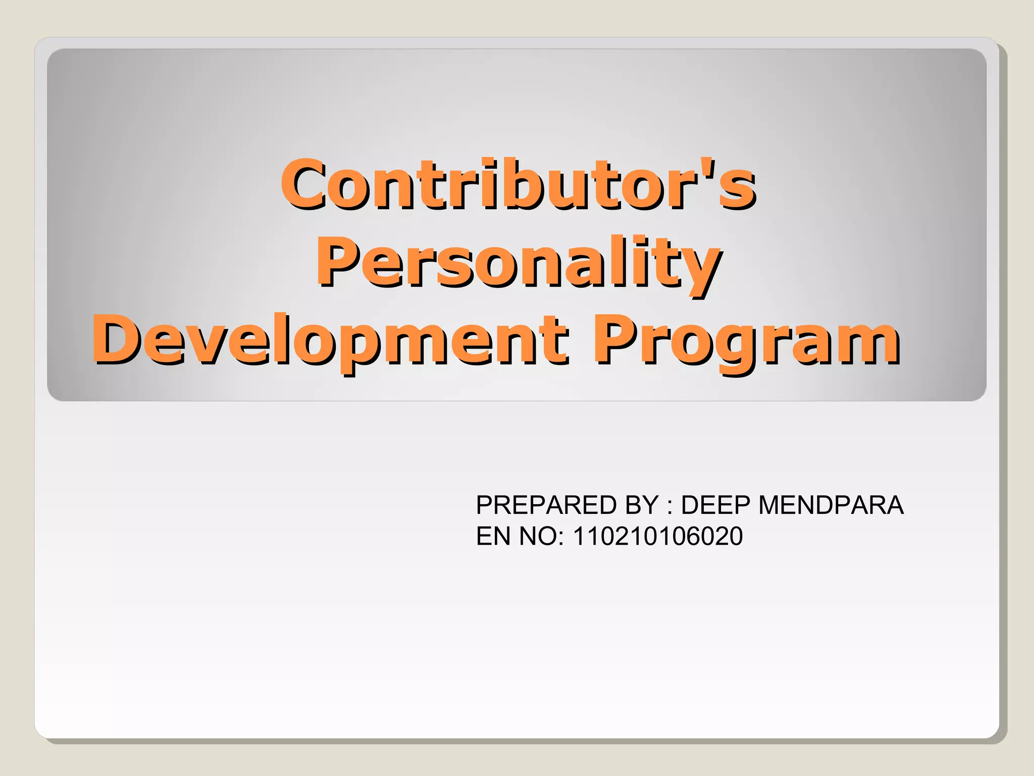 This document summarizes a contributor's personality development program using examples from three popular movies: 3 Idiots, Tare Zameen Par, and Iqbal. In 3 Idiots, the character Amirkhan is highlighted as a good contributor who is able to inspire and support his friends through difficult times in their studies. In Tare Zameen Par, Amirkhan recognizes the artistic skills of Nikhil and helps him develop his talents. In Iqbal, the character Nasarudin Shah helps Iqbal hone his cricket bowling skills to achieve success at the international level.
