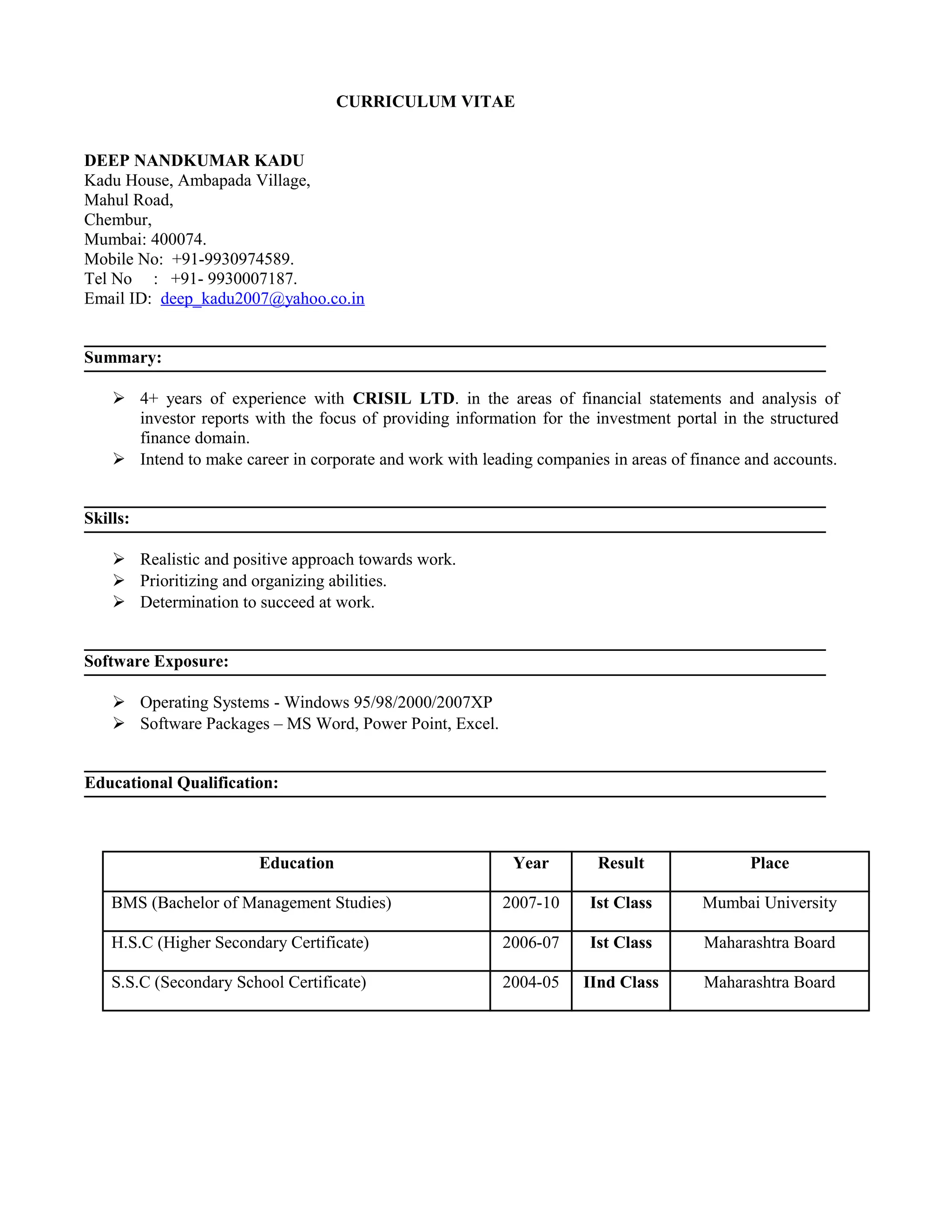 Deep Nandkumar Kadu has over 4 years of experience working at CRISIL LTD in financial statement analysis and providing information to investors. He has skills in prioritizing work, being realistic, and determination to succeed. He is seeking a career in corporate finance and accounts. He has a Bachelor's degree and work experience analyzing reports, preparing documents, and achieving awards for his work quality.