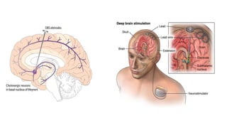 The basal ganglia are brain nuclei that coordinate movement and cognitive functions. Deep brain stimulation (DBS) involves surgically implanting electrodes into the basal ganglia to deliver electrical stimulation for treating movement and neuropsychiatric disorders like Parkinson's disease. DBS was introduced in the 1990s and works by inhibiting or activating target areas in the basal ganglia to disrupt pathological oscillations. Common targets for stimulation include the subthalamic nucleus and globus pallidus. DBS improves motor symptoms in Parkinson's patients and allows for reductions in medication. Potential risks include infection, bleeding in the brain, and device-related complications.