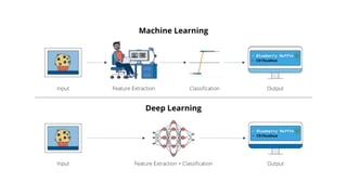 Deep computer vision uses deep learning and machine learning techniques to build powerful vision systems that can analyze raw visual inputs and understand what objects are present and where they are located. Convolutional neural networks (CNNs) are well-suited for computer vision tasks as they can learn visual features and hierarchies directly from data through operations like convolution, non-linearity, and pooling. CNNs apply filters to extract features, introduce non-linearity, and use pooling to reduce dimensionality while preserving spatial data. This repeating structure allows CNNs to learn increasingly complex features to perform tasks like image classification, object detection, semantic segmentation, and continuous control from raw pixels.