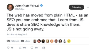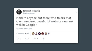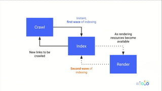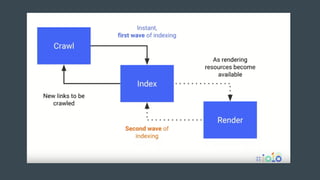 The document discusses the challenges of indexing JavaScript-powered websites by search engines. It notes that JavaScript rendering takes significant computational resources, straining crawlers' budgets. It also suggests that client-side rendered JavaScript websites have difficulties with search engine indexing and ranking, as content may be missed during Google's two-wave indexing process for JavaScript. The document recommends using server-side rendering, hybrid rendering, or prerendering to help search engines properly index JavaScript websites.