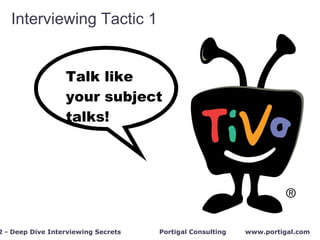 The document provides tips for conducting deep dive interviews to obtain key information. It recommends talking like the subject, sequencing questions from general to specific, asking about specific examples, peer comparisons, projections, quantities, changes over time, and clarifying responses. The document advises against asking survey-style questions that are leading, presumptive, insulting, biased, or useless. Interviewers should obtain detailed information by skillfully questioning subjects.