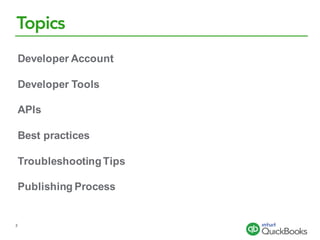 The document provides comprehensive guidelines for developers working with the QuickBooks API and Intuit Developer Platform. Key topics include setting up developer accounts, utilizing sandbox environments, obtaining production keys, and best practices for data integration and publishing applications. It also outlines the technical and security requirements for interfacing with Intuit's services and includes links to relevant tools and resources.