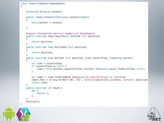 1) This document provides an overview of Xamarin and building Android apps. It discusses components like Xamarin.Mobile that allow writing code once across platforms.