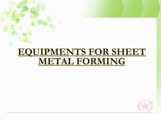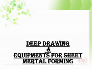 This document provides information about deep drawing and sheet metal forming equipment. It discusses the history and definition of deep drawing, the mechanics and process of drawing, types of deep drawing stations like blanking, drawing, piercing and trimming. It also describes the metal flow during drawing, recommended tool materials, lubrication and cooling methods, common defects, advantages and disadvantages of deep drawing. Different applications of deep drawing in Pakistani industry are highlighted. Comparisons are made between deep drawing and superplastic forming. Finally, various metal forming tools and types of forming dies are explained.