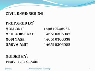 The document discusses advanced construction technology focusing on excavation methods, timbering of trenches, and dewatering techniques. It outlines shallow and deep excavation, detailing the necessity and methods of timbering to ensure safety and structural integrity. Additionally, various dewatering methods are presented for managing groundwater during excavation processes.