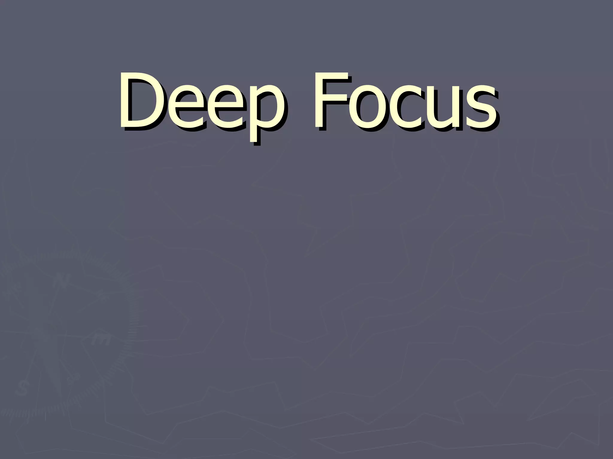 Deep focus composition uses a short focal length lens to keep all three planes of a scene - foreground, middle ground, and background - in sharp focus, creating an illusion of depth. It allows the cinematographer to exploit the size and placement of people and objects in the frame to convey meaning and conflict. The arrangement and scale of objects between the planes can determine meaning in a film, with small exaggerated objects in the foreground emphasizing important meaning to the audience.