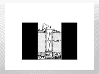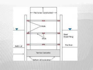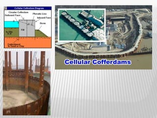 Deep foundations are used when the bearing capacity of soil near the surface is insufficient or space is restricted for shallow foundations. Deep foundations extend below the shallow soil layers to reach stronger soil at depth. Common types include pile foundations, caisson foundations, and cofferdams. Pile foundations transmit structural loads to the ground through end bearing on a hard layer or side friction along the pile. Piles can be made of timber, concrete, steel, or a composite of materials. The type of pile used depends on factors like soil conditions, structural loads, material availability, and cost.