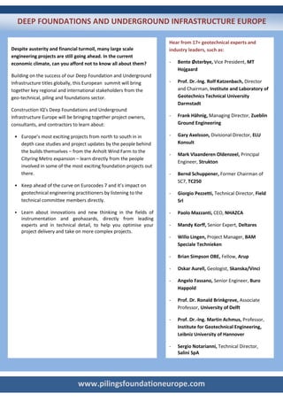 The event 'Deep Foundations and Underground Infrastructure Europe' takes place from July 9-11, 2012, in Milan, Italy, gathering over 17 geotechnical experts and project owners to discuss major deep foundation projects and innovations in geotechnical engineering. Attendees will learn about the recent revisions to Eurocode 7, network with industry leaders, and explore case studies from ongoing projects like the Anholt Windfarm and the Cityringen metro expansion. The conference also includes presentations on risks, instrumentation, and advancements in offshore foundation construction.