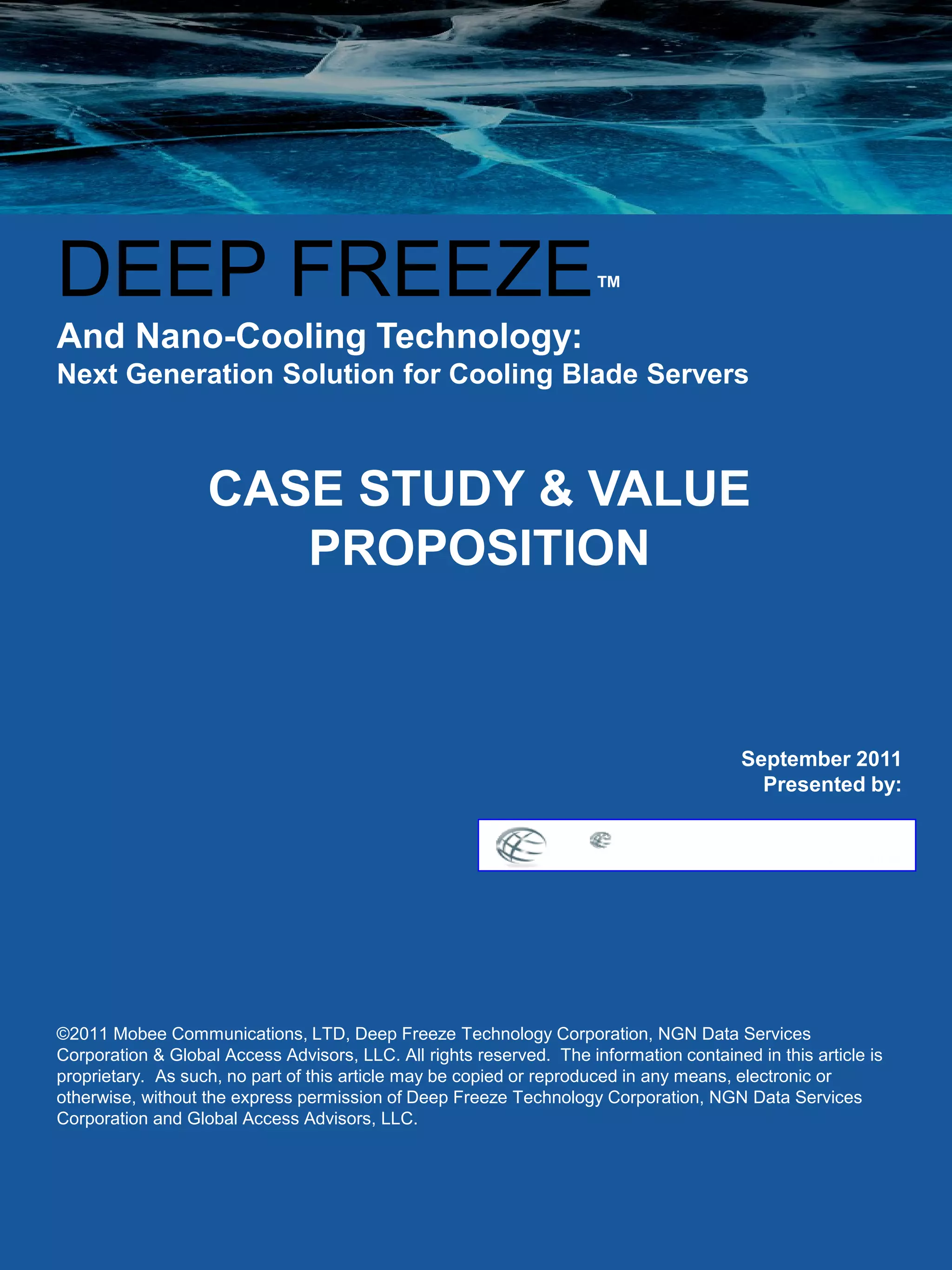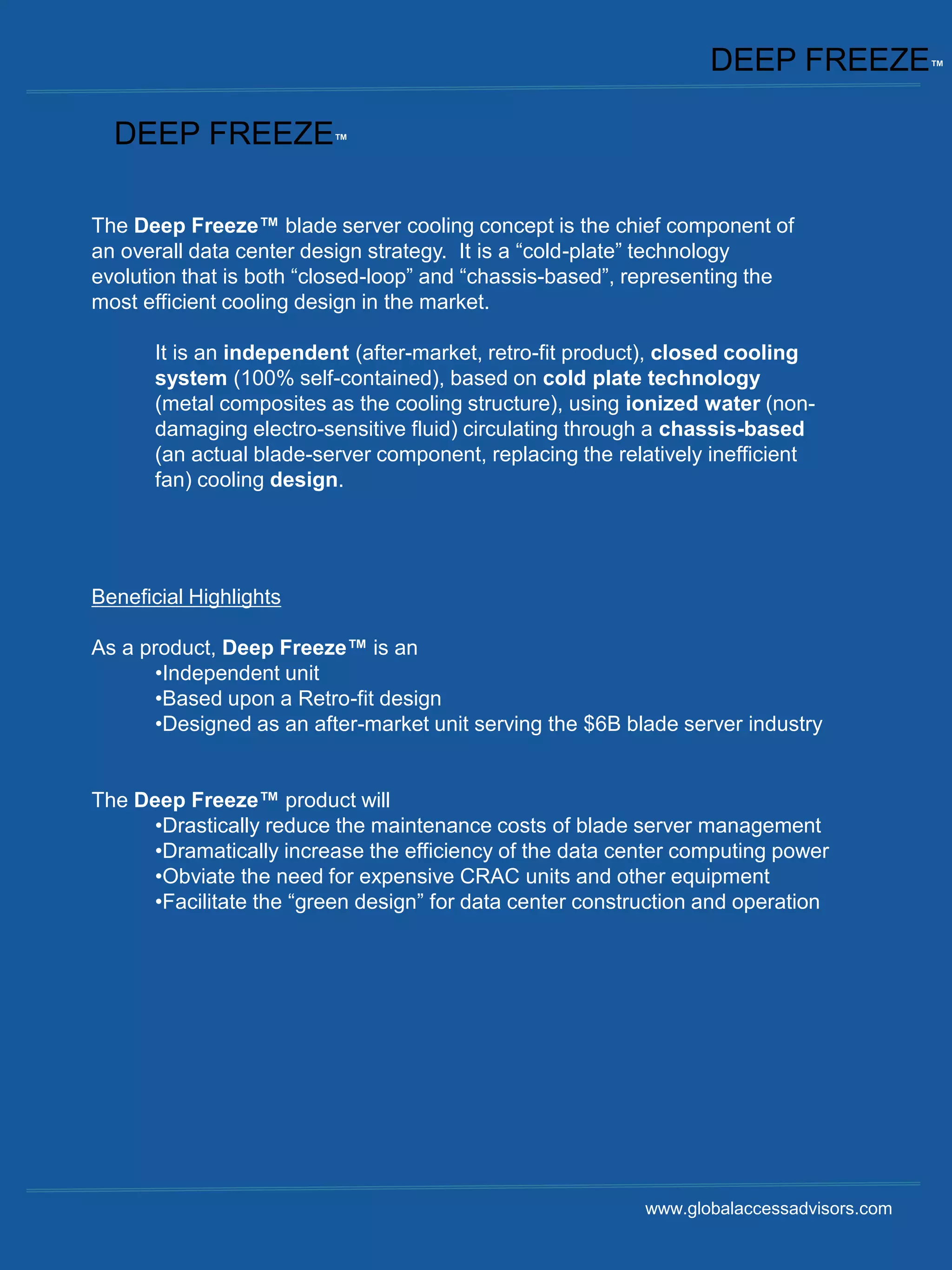 The document discusses Deep FreezeTM, a next generation liquid cooling technology for blade servers. Deep FreezeTM uses ionized water circulating through a chassis-based heat sink as a closed-loop system. This allows it to efficiently cool blade servers within the chassis in a self-contained manner, without mixing hot and cold air or requiring complex CFD analysis of airflow. Deep FreezeTM addresses increasing data center cooling challenges and offers benefits like reduced maintenance costs and increased computing efficiency over traditional air-cooling methods. It represents the most efficient blade server cooling design currently available.
