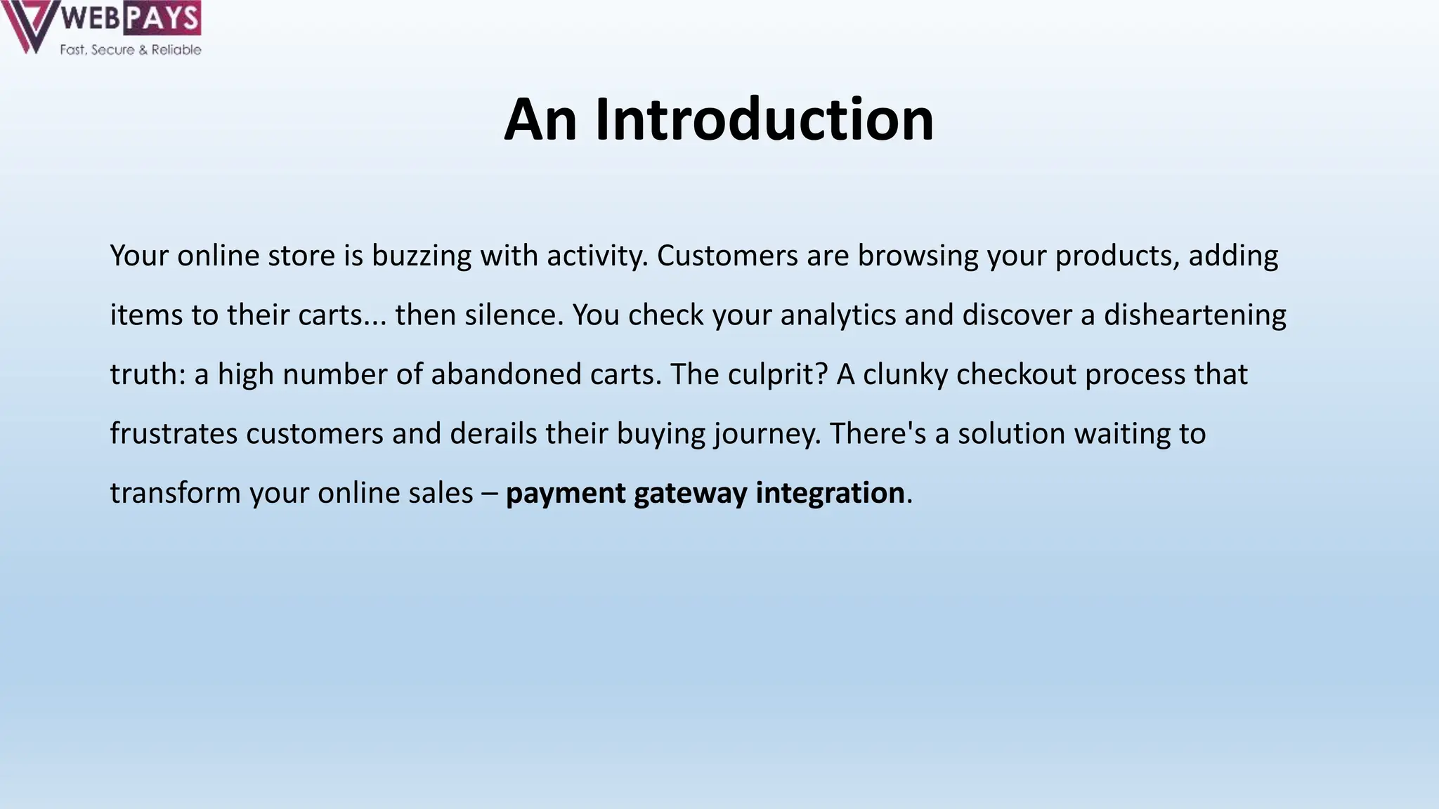 The document discusses the importance of payment gateway integration for online stores to reduce cart abandonment and improve customer experience. It outlines different types of payment gateways—integrated, hosted, and self-hosted—highlighting their advantages and the role of security and payment options in enhancing sales. The future of payment gateways is also explored, focusing on emerging technologies and evolving customer expectations that will shape the industry.