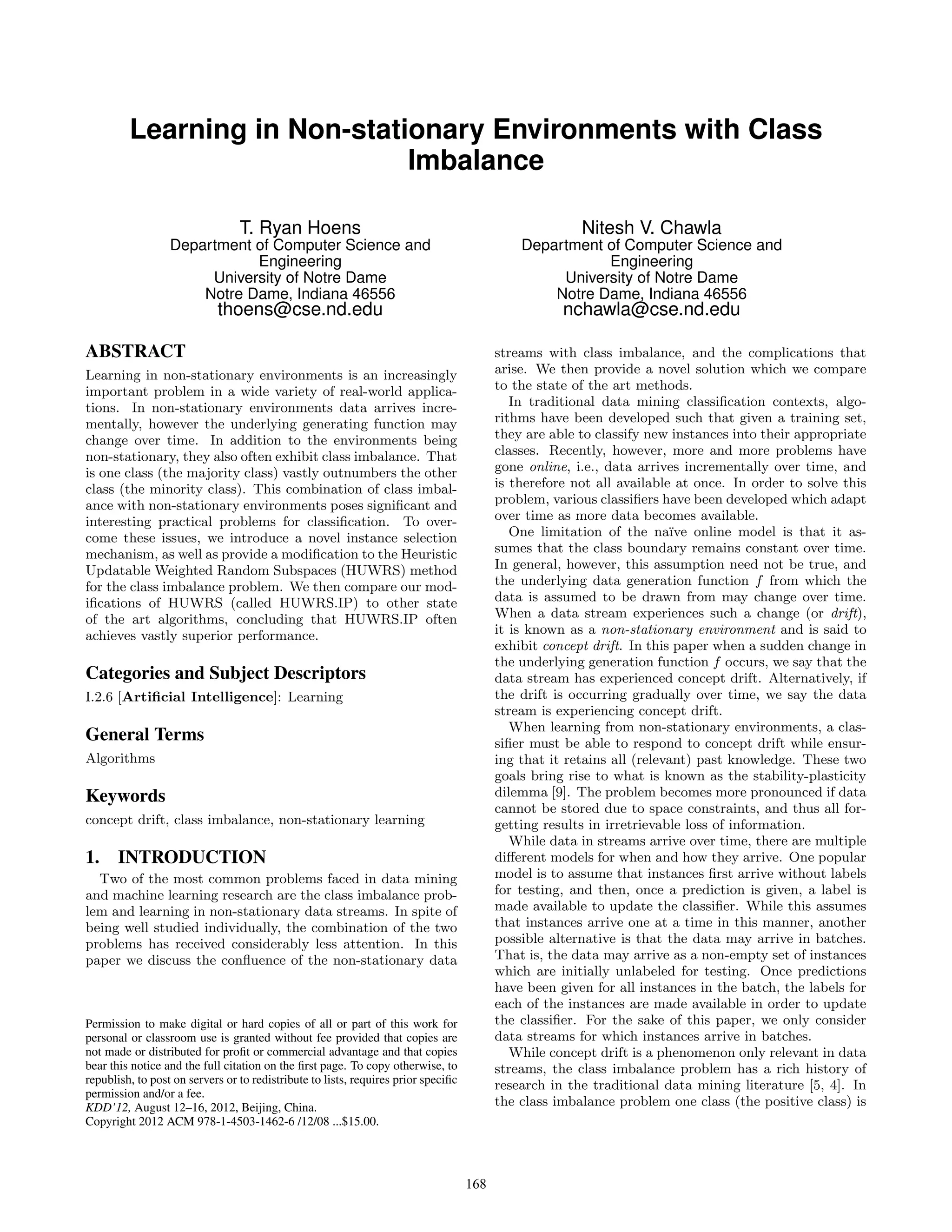 This document discusses learning in non-stationary environments with class imbalance. It introduces a novel instance selection mechanism and modifies the Heuristic Updatable Weighted Random Subspaces (HUWRS) method to address class imbalance in non-stationary data streams. The key contributions are a new instance selection method for the minority class in drifting data streams with imbalance, and HUWRS with Instance Propagation (HUWRS.IP), which is shown to outperform state-of-the-art methods on several streaming datasets.
