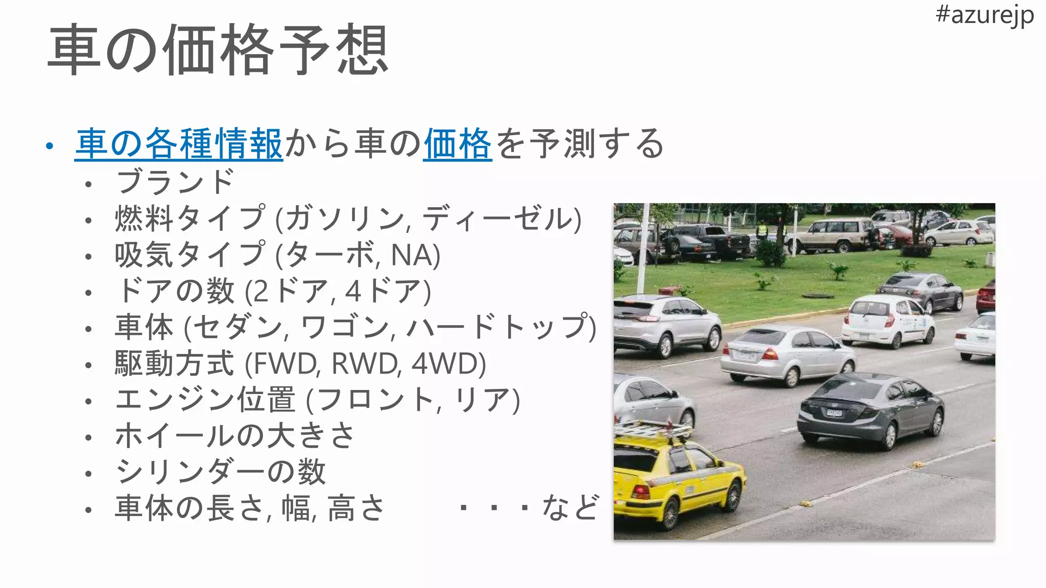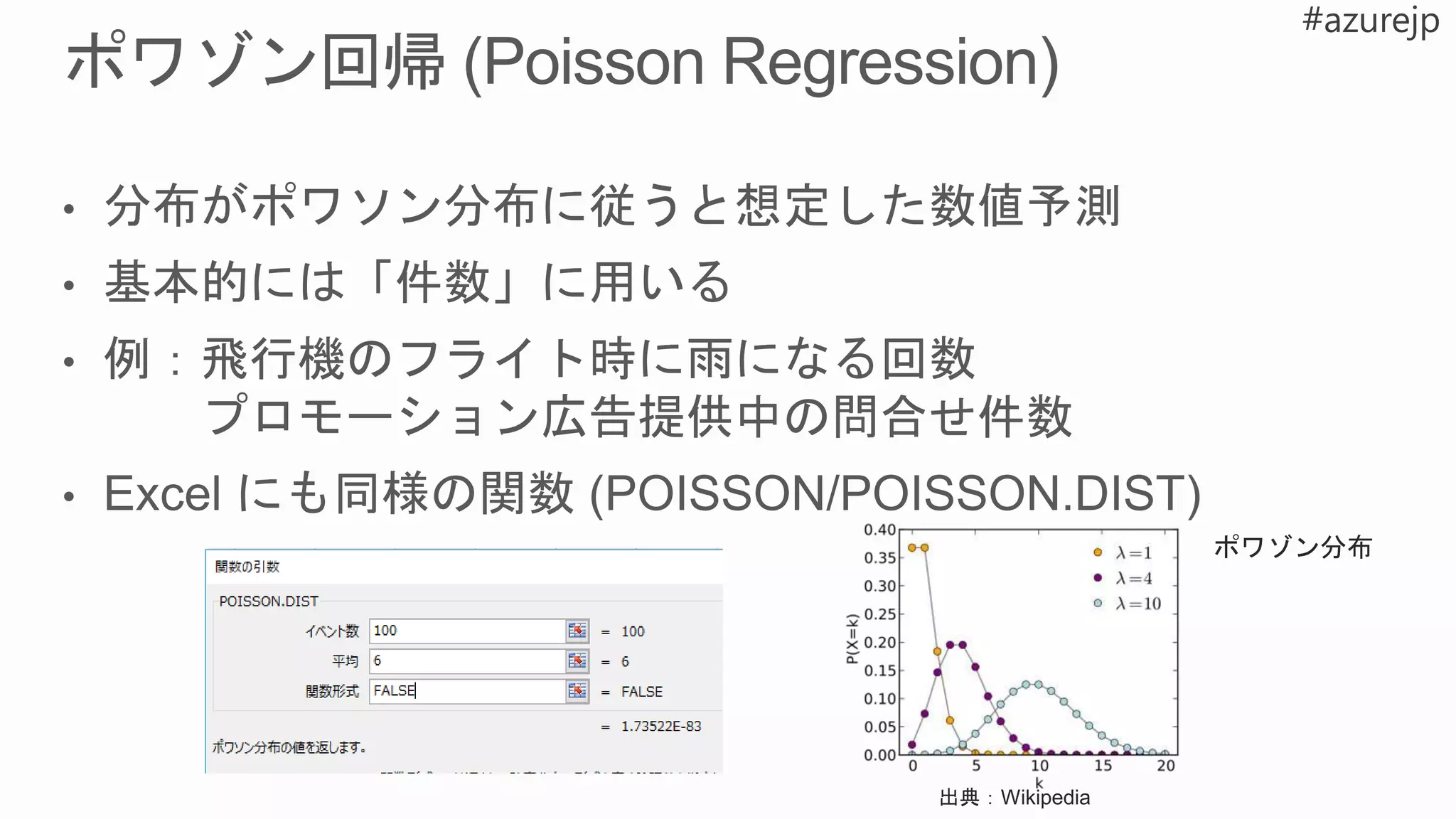 例 Linear Regression 線形回帰 線形モデルによる解析をしたい。ある データが増減すると、それに伴って結 果も増減する Bayesian Linear Regression ベイズ線形回 帰 Linear Regressionと同様だが、確率分 布を用いる Ordinal Regression 順序回帰 順序尺度のつけたい場合 「1=良い」「2=普通」 「3=悪い」 Position Regression ポアソン回帰 特定の事情に関する回数 「1時間に通過する人数」 「1日に受信するメール 数」 Fast Forest Quantile Regression 高速フォレス ト分位点回帰 データがどのように分布しているのか Decision Forest Regression 決定フォレス ト回帰 分布予測するのに用いる。精度は高い が学習に時間がかかる Boosted Decision Tree Regression ブースト決定 木回帰 分布予測するのに用いる。精度が高く、 高速だが、高メモリが必要。