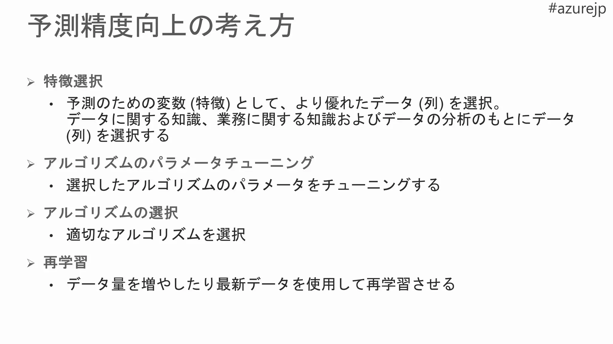回帰分析 線形回帰 ベイズ線形回帰 ポワソン回帰 順序回帰 ニューラルネットワーク 決定木 ランダムフォレスト Decision Jungle 分位点回帰 統計分類 ロジスティクス回帰 サポートベクタマシン 決定木 ランダムフォレスト ニューラルネットワーク Locally-Deep サポートベクタマシン ベイズポイントマシン 平均化パーセプトロン Decision Jungle