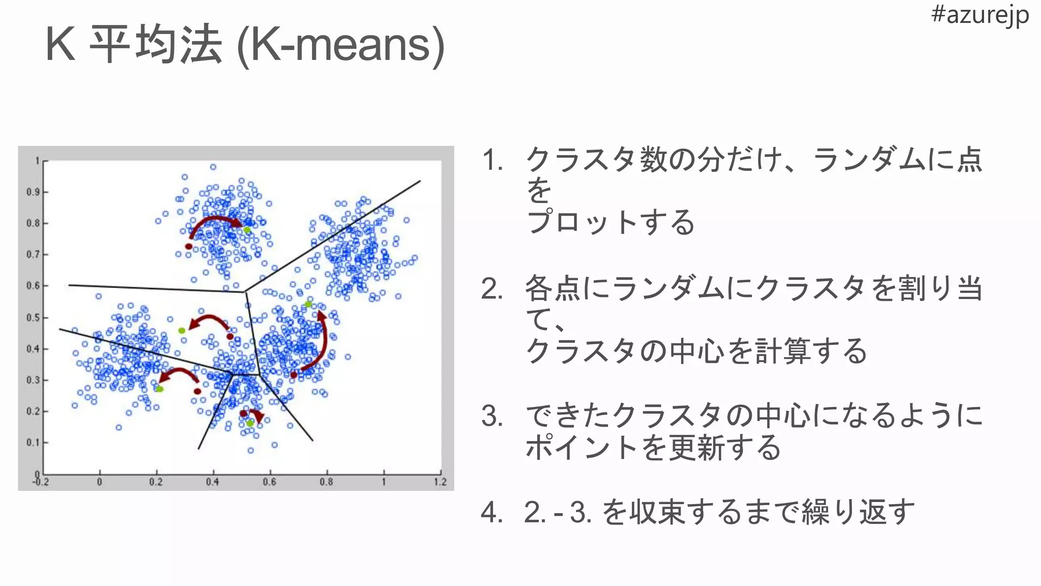 母集団に属する要素が、ある基準で分類された集合のどこに属するかを予測 する • どのメールがスパムか?(メールの属性データを使用し、「スパムである」 「スパムでない」 に分類) 「教師あり」 学習 クラスタリ ング 特定の分類基準を与えず、属性データから類似性から、母集団をグルーピン グする • どの顧客グループにどのような製品を提案するべきか? 「教師なし」 学習