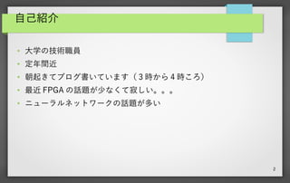 制御用ア プリケーションソフトを作成 1 ● PYNQ ボードの Debian 上で手書き数字 CNN 制御用アプリケーションソフトを作成した ● FPGA に実装した固定小数点のハードウェア と ARM Cortex-A9 650MHz の性能を比較し た ● gcc のオプティマイズオプション無しのとき – ハードウェア処理時間ー 12.9ms – ソフトウェア処理時間ー 60.8ms – SW 処理時間 /HW 処理時間≒ 4.71 倍