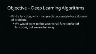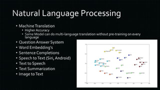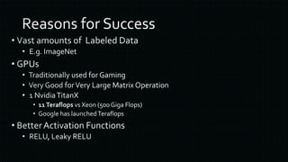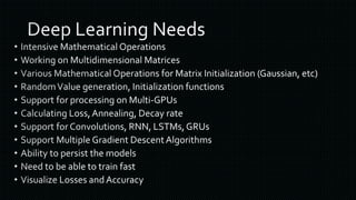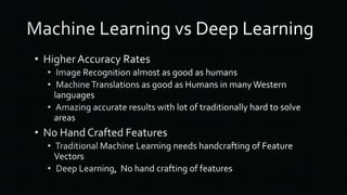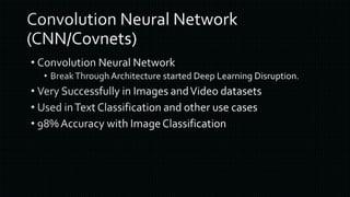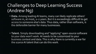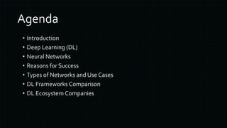 The document discusses various frameworks and architectures within deep learning, highlighting their adoption by prominent organizations such as Google, Microsoft, and Facebook. It also covers the types of neural networks, applications of deep learning, and the hardware and operating systems that support these technologies. Additionally, it outlines challenges in the deep learning ecosystem and notable companies leading in AI advancements.