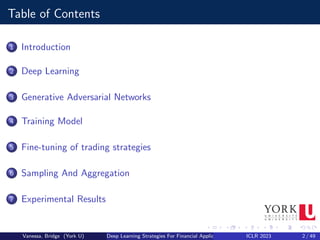 This document summarizes a presentation about using generative adversarial networks (GANs) and ensemble modeling for financial applications. It discusses how GANs can generate synthetic financial time series data to augment training datasets and test trading strategies. The presentation covers GAN and conditional GAN architectures, model training procedures, and experiments evaluating trading strategy performance on synthetic versus real data. It finds that ensembling multiple strategies trained on synthetic data outperforms individual strategies, demonstrating the value of GANs and ensemble modeling for financial applications.