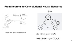 The document discusses the architecture and functioning of Convolutional Neural Networks (CNNs), emphasizing the layers involved, such as hidden, output, and convolutional layers. It describes techniques for reducing the number of parameters, including the use of local connections, translation invariance, pooling, padding, and stride. The examples provided reference specific architectures, such as lenet-5, to illustrate how these concepts are applied in practice.