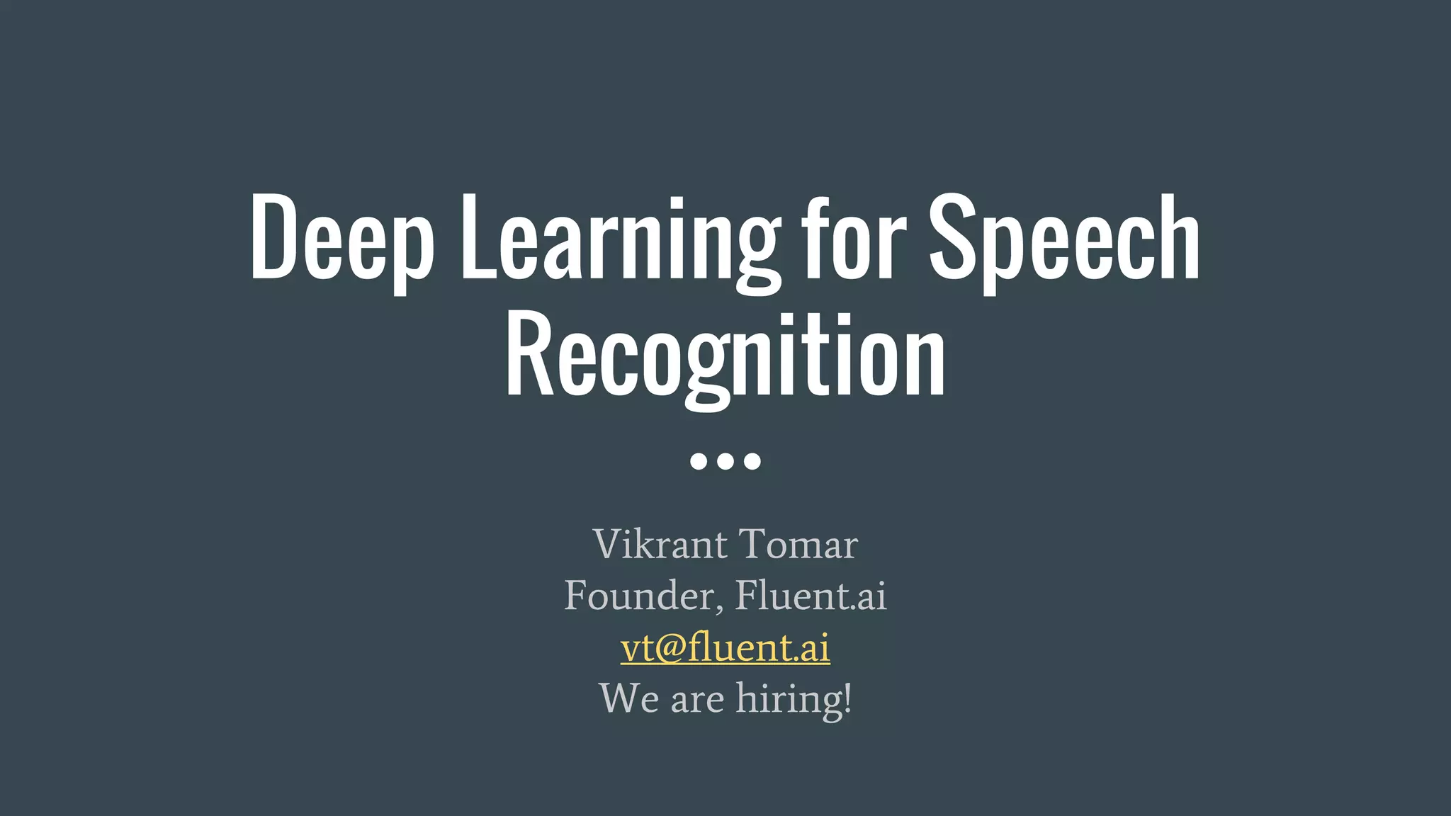 The document provides an overview of deep learning applications in speech recognition, detailing the evolution from conventional GMM-HMM systems to advanced deep neural networks like CNNs and RNNs/LSTMs. It discusses the challenges unique to speech data, the architecture of ASR systems, and innovative approaches such as end-to-end models. The conclusion highlights resources for further exploration and development in this field.