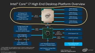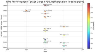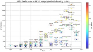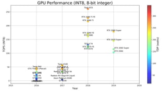 The document discusses the current hardware landscape for deep learning, highlighting the predominance of GPUs, the emergence of TPUs and FPGAs, and advancements in neuromorphic and quantum computing. It details various CPU and GPU architectures, memory speed, and the performance impact of different computing instructions optimized for machine learning tasks. Additionally, the document covers the evolution of deep learning libraries and infrastructure, emphasizing the need for energy efficiency and suitable architectures for deep learning applications.