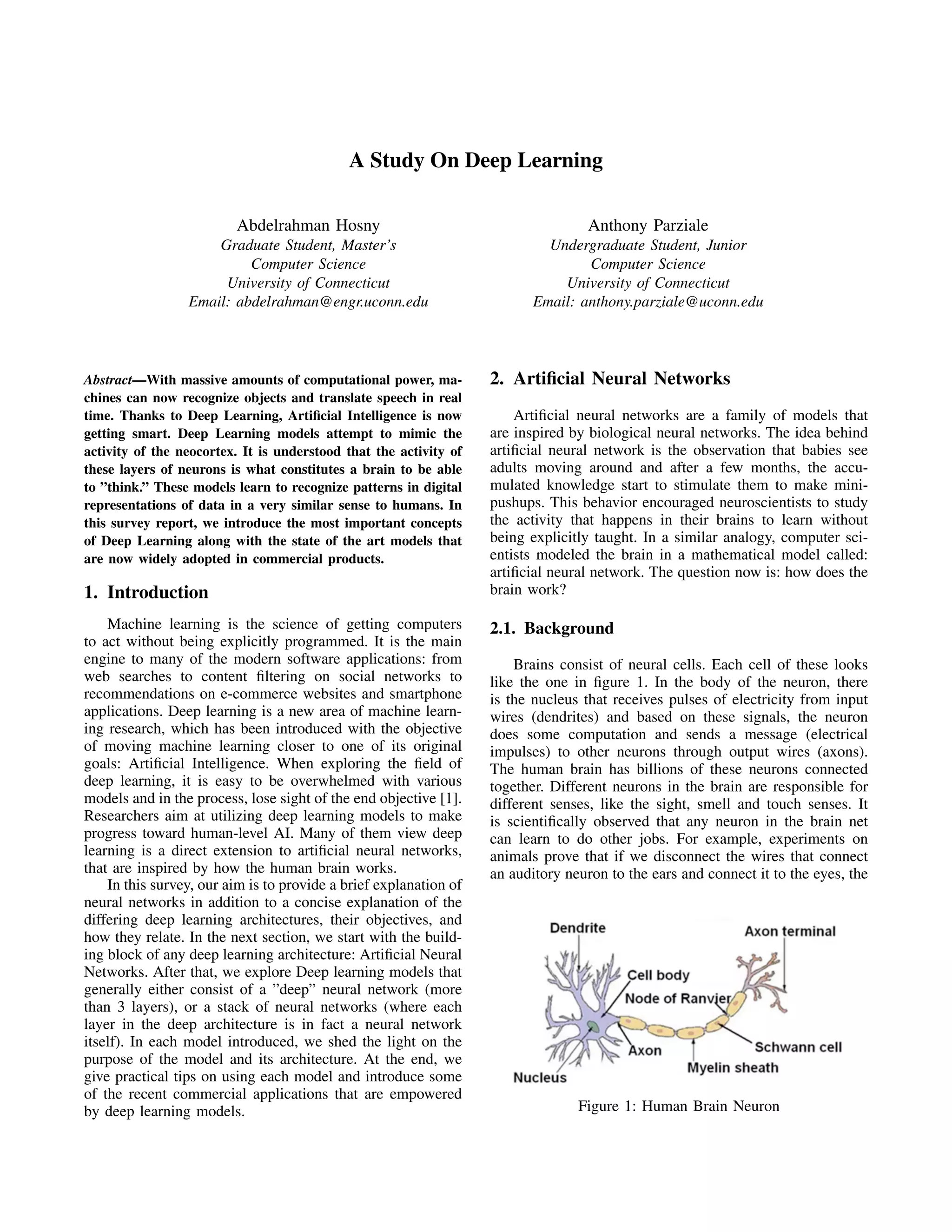 This document provides a summary of a study on deep learning. It introduces artificial neural networks as the building blocks of deep learning architectures. Neural networks are modeled after the human brain and consist of interconnected nodes that learn patterns in data. Deep learning aims to develop human-level artificial intelligence. The document explains key concepts like activation functions, which introduce non-linearity, and backpropagation, which is used to train neural networks by minimizing error. It surveys popular deep learning models and their objectives, like convolutional neural networks for computer vision and recurrent neural networks for language.