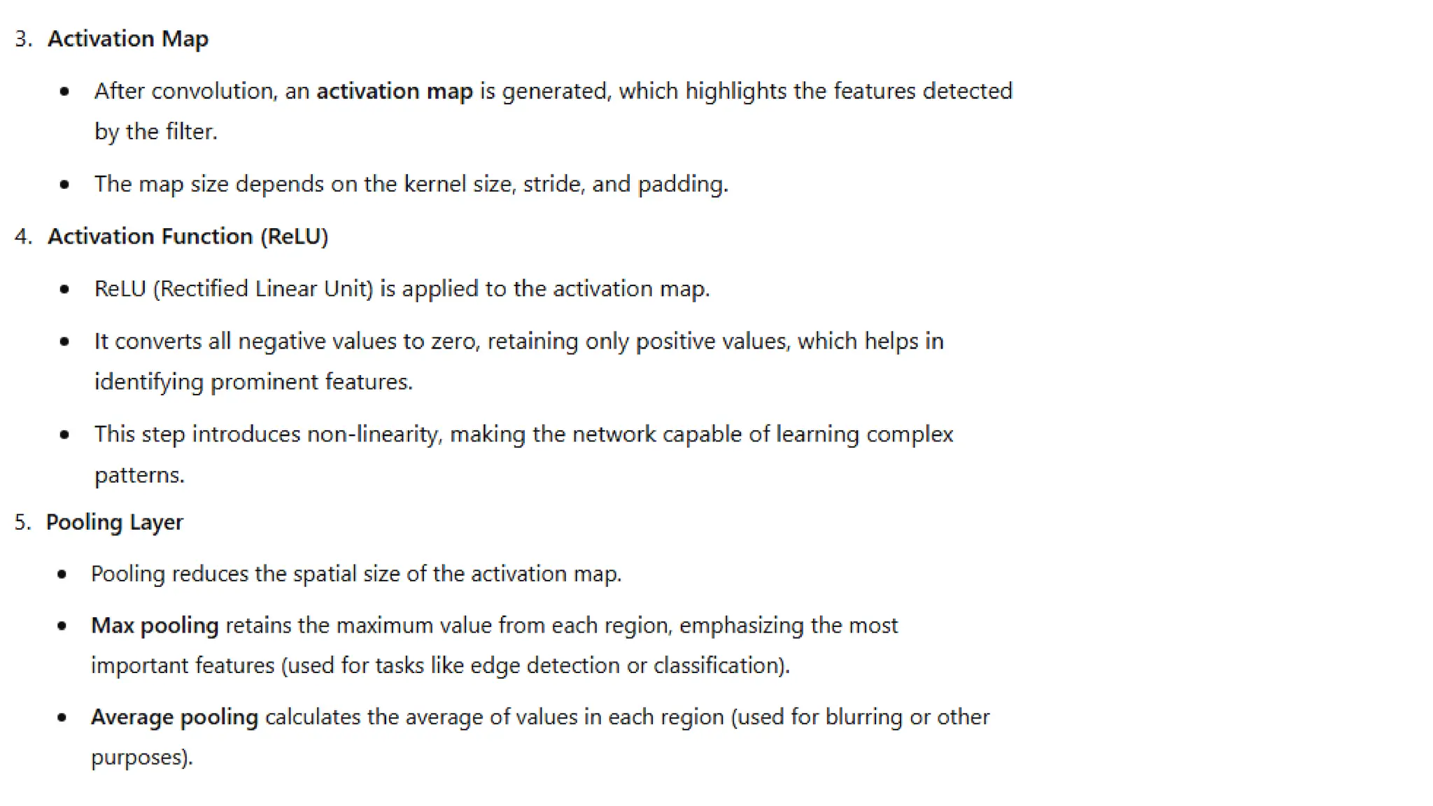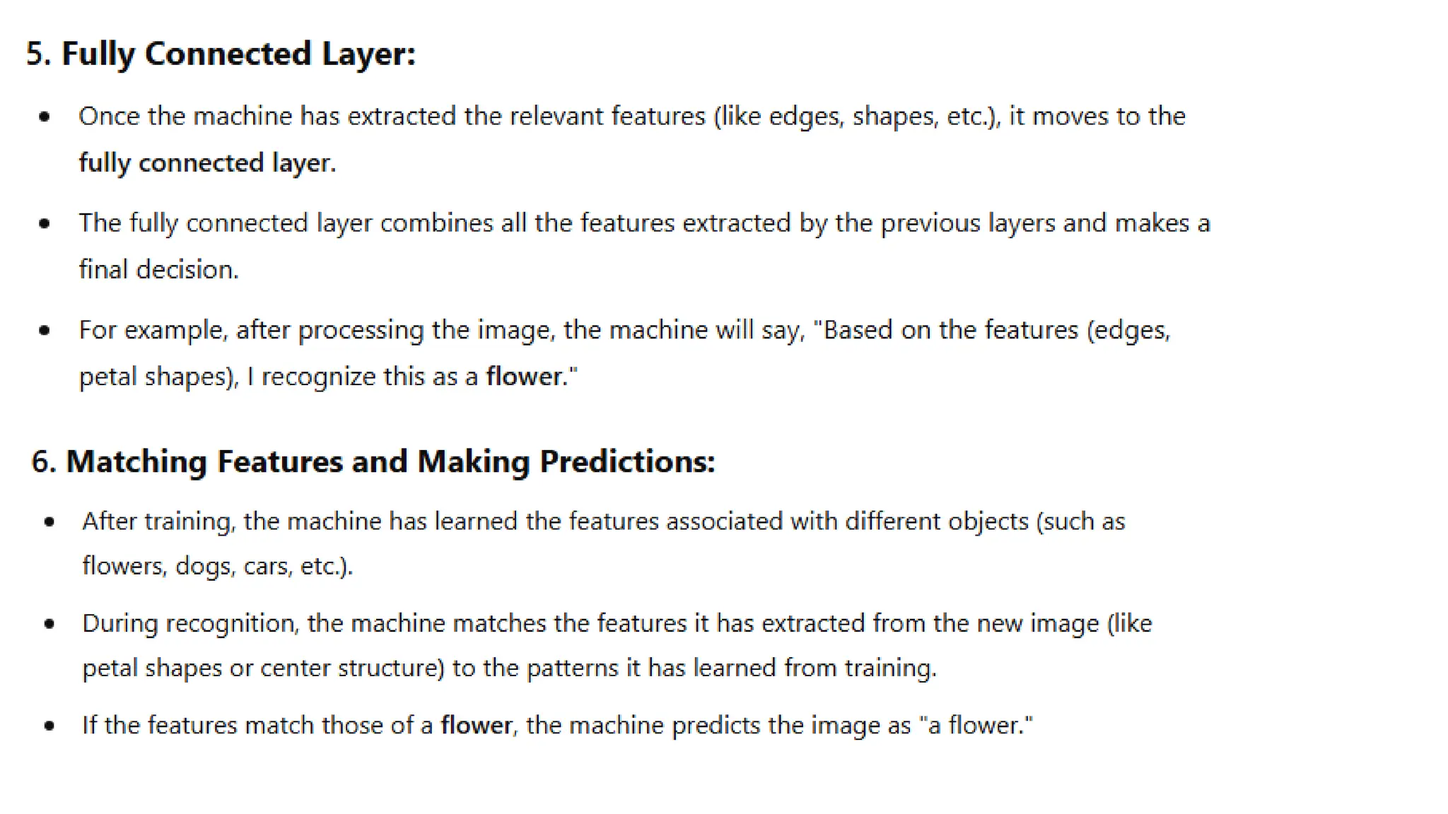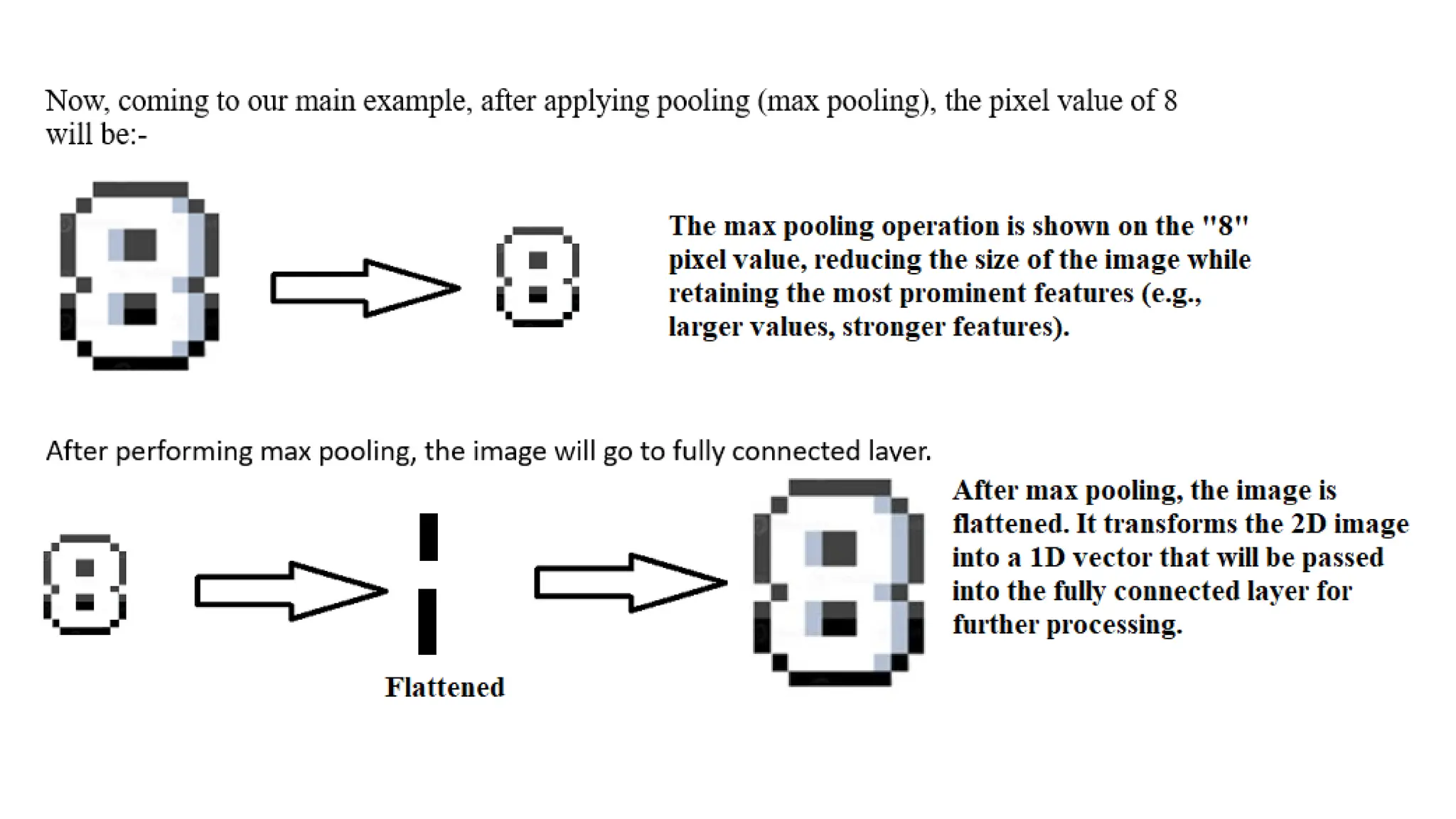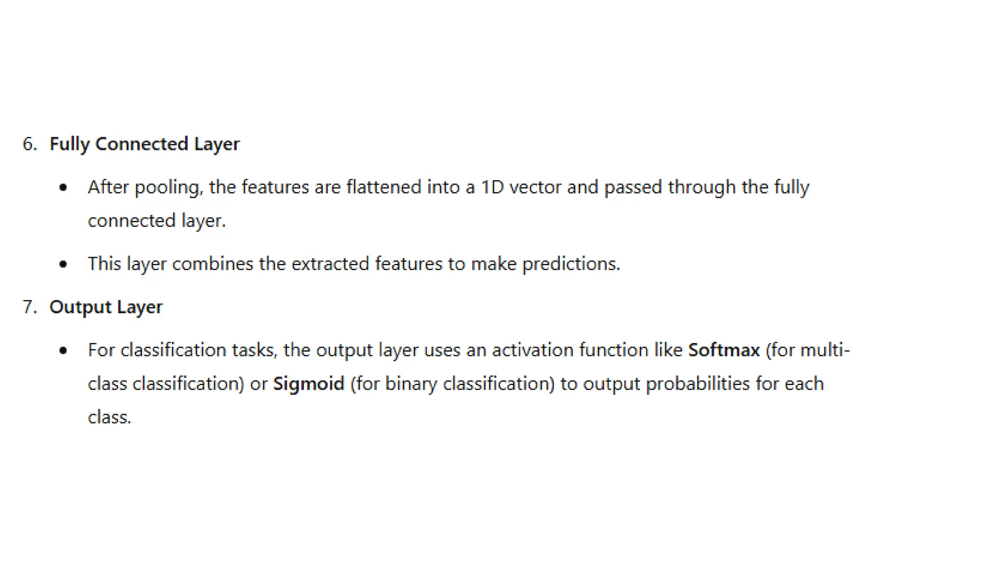 Pooling layers (such as max pooling or average pooling) reduce the spatial dimensions of the feature maps while preserving important information. This not only decreases computational load but also helps make the network more robust to small translations or distortions in the input. After several convolutional and pooling layers, the network flattens the high-level feature maps into a vector, which is passed through fully connected layers to produce the final output, such as class scores in image classification.