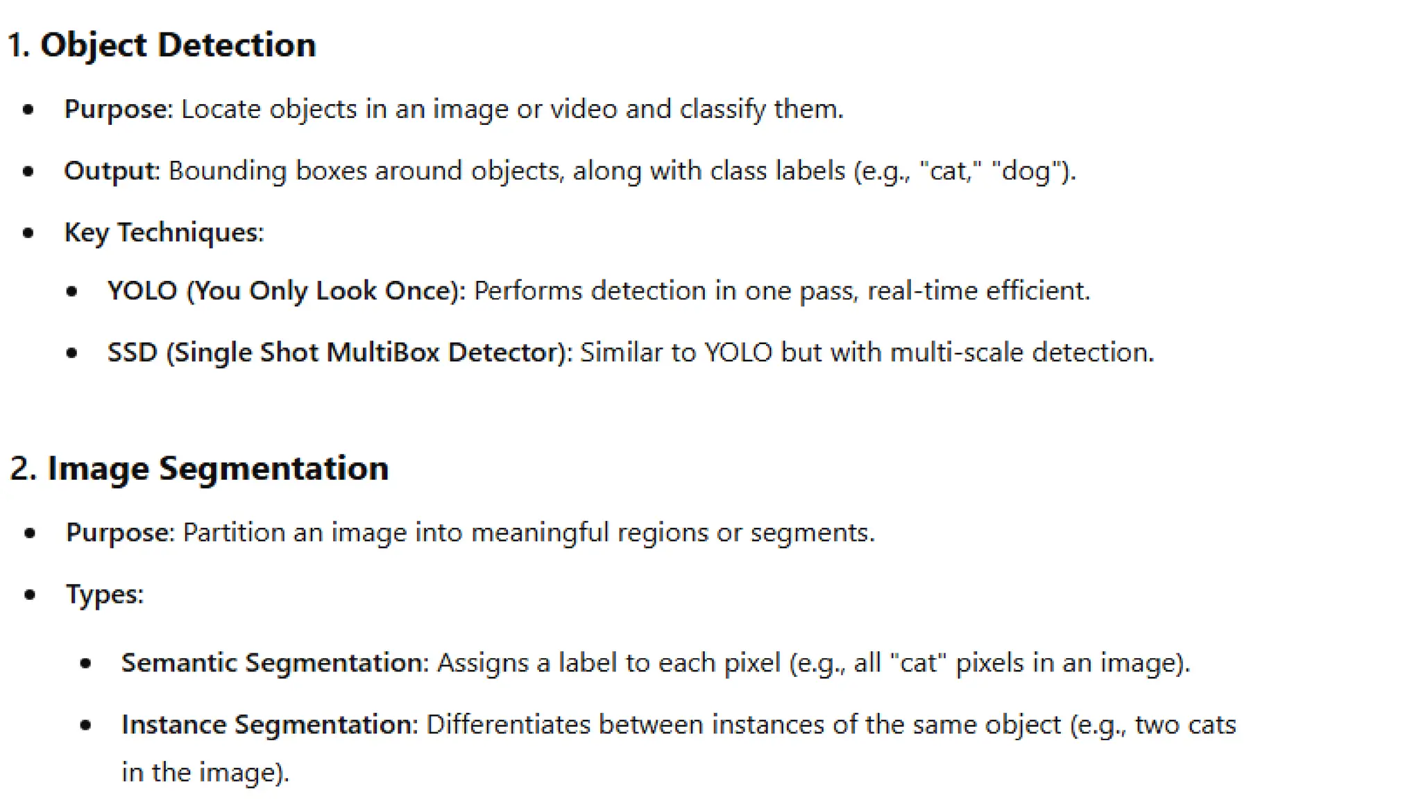 The applications of CNNs extend far beyond image classification. They are used in object detection (for example, YOLO, Faster R-CNN), semantic segmentation (for example, U-Net), facial recognition, medical imaging diagnostics, autonomous driving, video analysis, and even style transfer or super-resolution image generation.