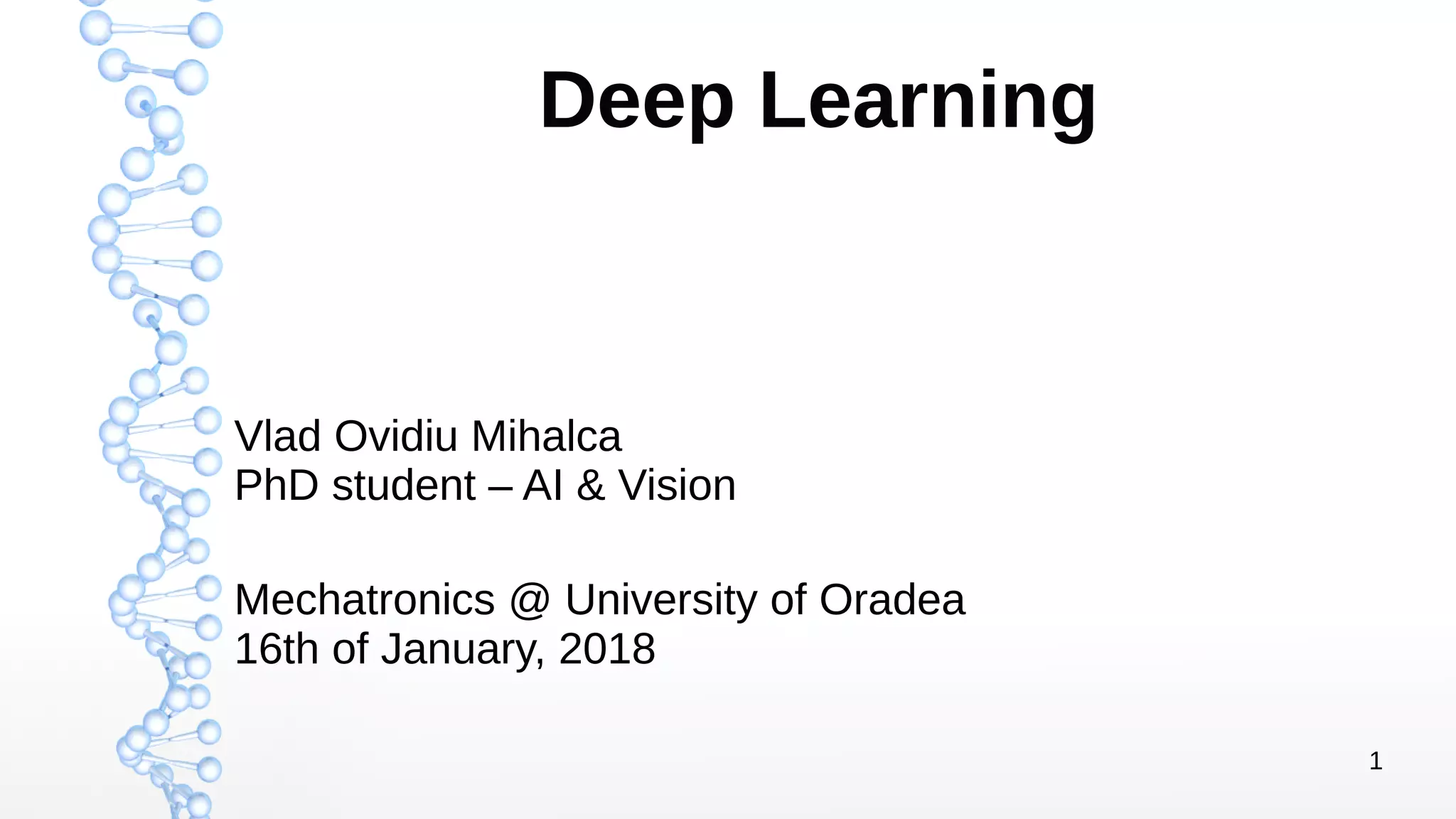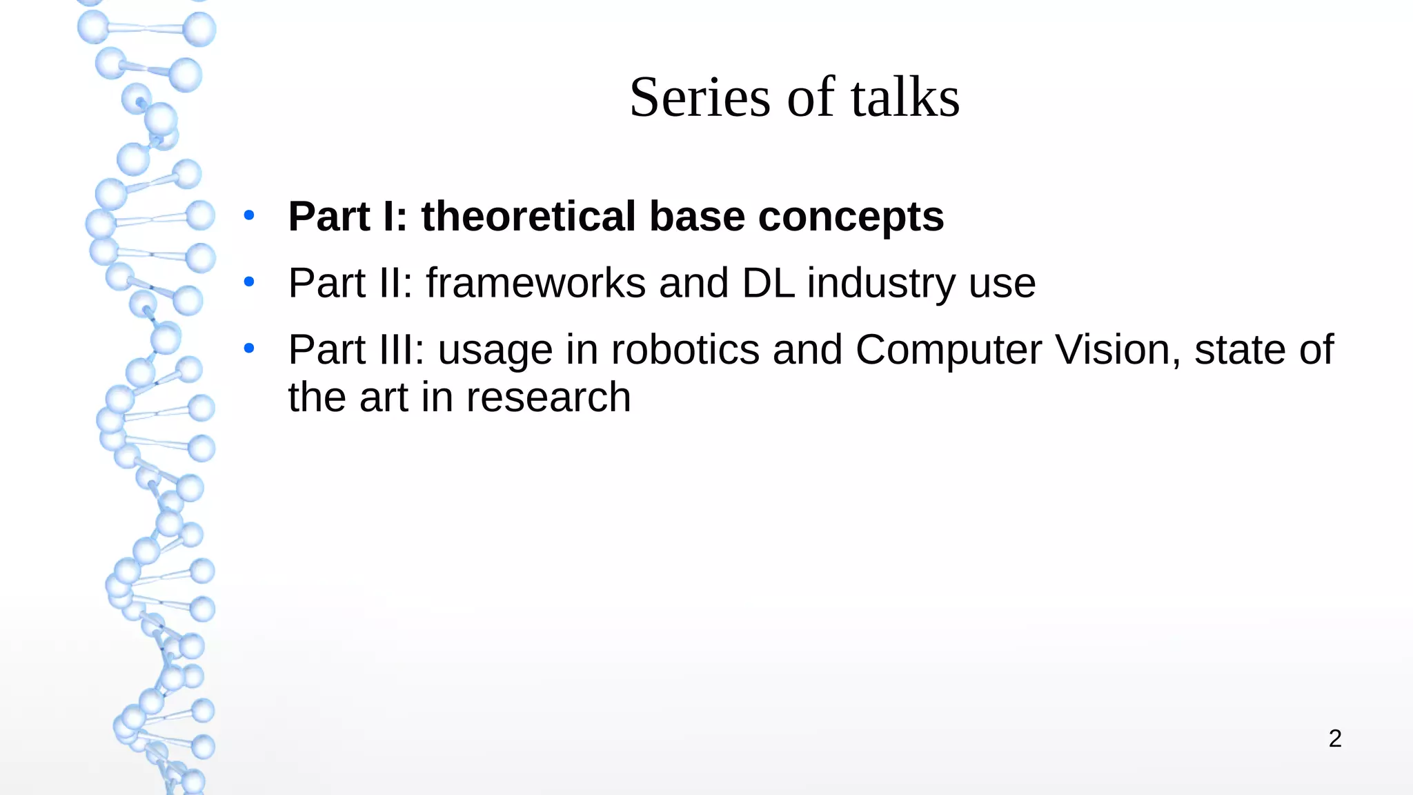 The document presents an introduction to deep learning, covering its theoretical concepts, frameworks, and applications in various fields such as robotics and computer vision. It details the evolution of deep learning techniques, the structure of artificial neural networks, and essential processes like backpropagation and gradient descent. The document also addresses artificial neuron types, learning processes, and the significance of convolutional neural networks for image processing.