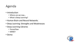 The document presents a comprehensive overview of deep learning, highlighting its history, concepts, strengths, weaknesses, and various libraries like TensorFlow and MXNet. It discusses the neural networks' architecture, including forward and backward propagation processes, as well as the applicability of deep learning in different domains. The presentation, delivered by Poo Kuan Hoong, emphasizes the robust nature of deep learning while also addressing its challenges and providing resources for further exploration.