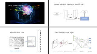 The document outlines a comprehensive introduction to practical deep learning using TensorFlow, covering key topics including machine learning concepts, neural network building, and practical implementations such as MNIST classification. It also delves into various machine learning algorithms, optimization techniques, and the architecture of neural networks. Additionally, it provides a detailed guide to utilizing TensorFlow for training deep learning models, specifically focusing on convolutional and fully connected networks.