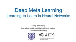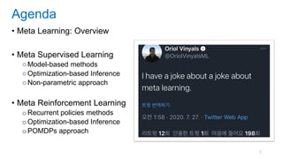 This document discusses deep meta learning and learning-to-learn in neural networks. It provides an agenda that covers an overview of meta learning, meta supervised learning approaches including model-based methods, optimization-based inference, and non-parametric approaches. It also briefly discusses meta reinforcement learning and recurrent policy, optimization-based inference, and POMDP approaches. The document seeks to explain what meta learning is, how to formalize and solve meta learning problems, common meta learning algorithms, and benchmark datasets for evaluating meta supervised learning.