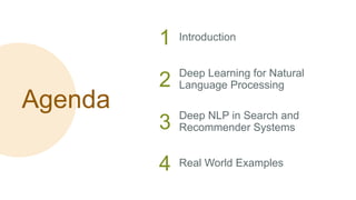 The document discusses the application of deep natural language processing (NLP) techniques in search and recommender systems. It covers the capabilities of deep learning for understanding user intentions, document retrieval, and ranking, as well as language generation for assistance. Several models and real-world examples are mentioned to illustrate the effectiveness of deep NLP in enhancing search and recommendation functionalities.